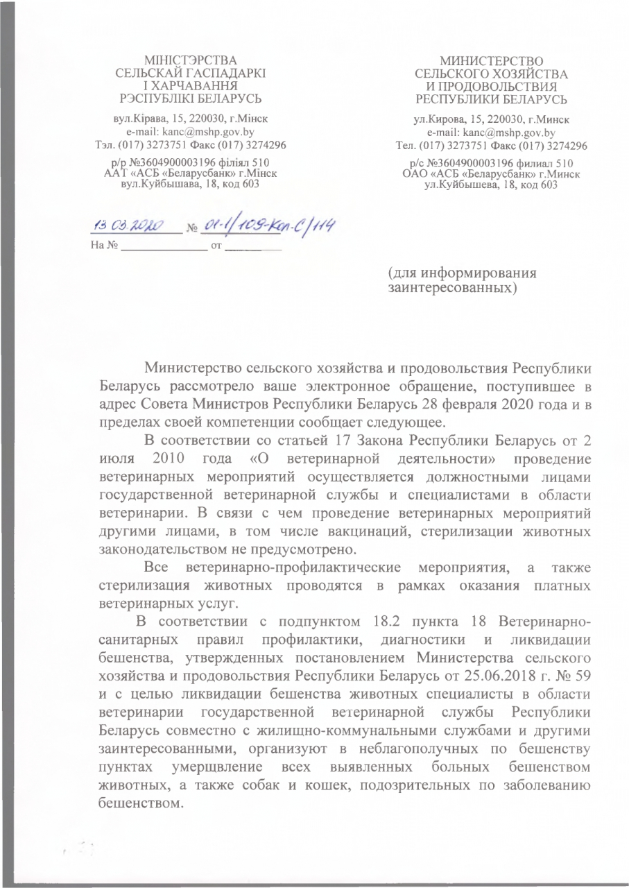 Поддерживая инициативу государства по гуманизации и упорядочению сферы обращения с животными в Республике Беларусь, мы согласны и считаем необходимым пойти по пути стран, исключающих практику умерщвления здоровых и подлежащих лечению животных- компаньонов. Считаем, что комплекс мер, направленный на регуляцию численности безнадзорных животных, должен отталкиваться исключительно от предлагаемой выше формулы и учитывать, в полном объеме, как меры по реализации гуманных методов сокращения численности безнадзорных животных, так и последствия внедрения мер, выполнение которых зависит от населения, если они не имеют характер рекомендуемых.