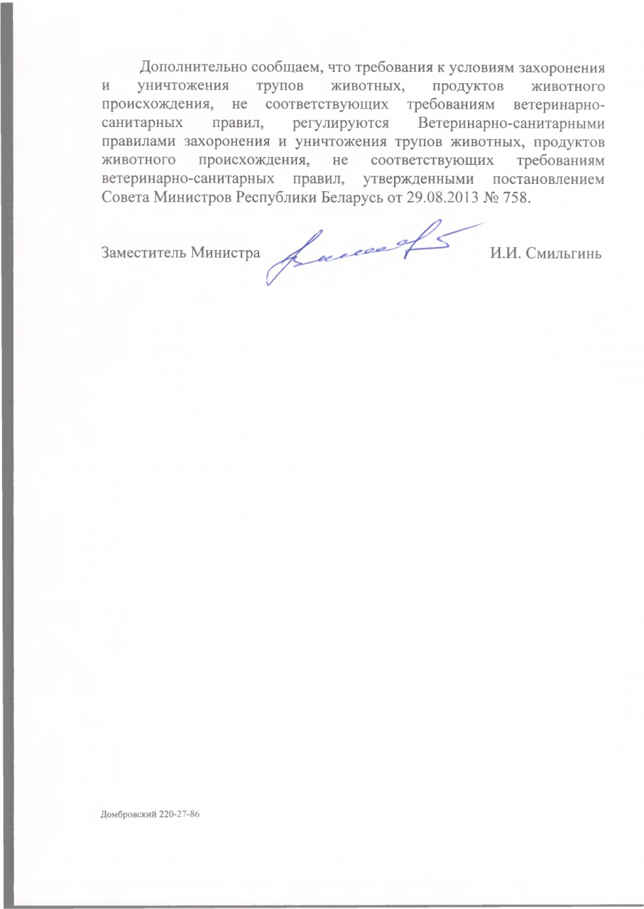 Просим не принимать постановление № 834 (об утверждении Правил содержания собак, кошек, а также отлова безнадзорных животных в нас. пунктах Республики Беларусь) в новой редакции, без отражения в нем условий по гуманному обращению с беспризорными животными в полном объеме.