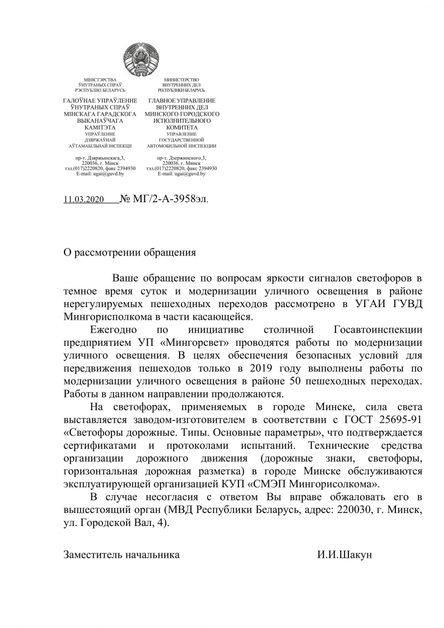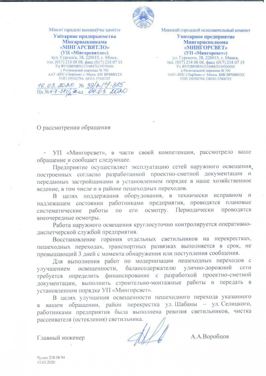 В последнее время двигаясь по городу Минску и его окрестностям в тёмное время суток, мы стали замечать, что многие пешеходные переходы не освещены должным образом и при этом высока вероятность просто не заметить пешехода. Поэтому предлагаем сделать все пешеходные переходы более безопасными, как для пешеходов, так и для водителей ТС. Для этого необходимо улучшить освещенность пешеходных переходов (далее - ПП), например, за счёт установки светодиодных фонарей. Осветить подходы к ПП. А также уменьшить яркость сигналов светофора в тёмное время суток (слепят похлеще фар встречного транспорта).