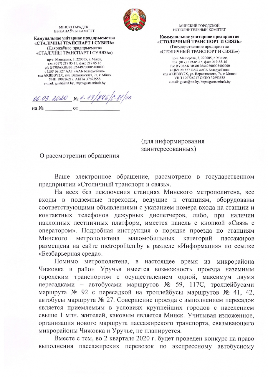 Мы, жители микрорайона "Чижовка" и иные заинтересованные граждане, убедительно просим и настаиваем на организации нового автобусного маршрута ДС Чижовка-Уручье.