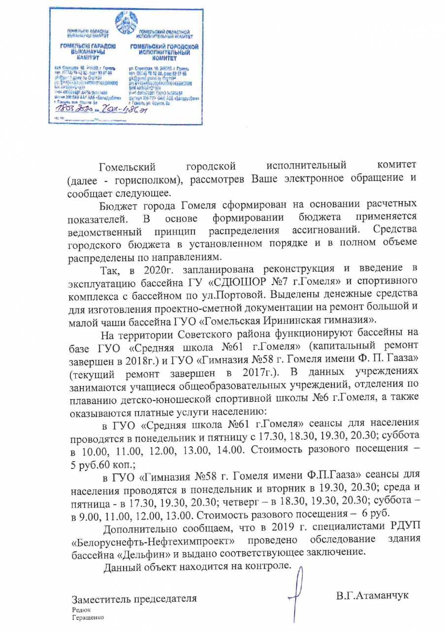 Средства городского бюджета распределены в полном объёме по направлениям: в 2020 г. запланирована реконструкция и введение в эксплуатацию бассейна ГУ "СДЮШОР №7 г.Гомеля" и спортивного комплекса с бассейном по ул.Портовой. Специалистами РДУП "Белоруснефть-Нефтехимпроект" проведено обследование здание бассейна "Дельфин" и выдано соответствующее заключение. Данный объект находится на контроле.