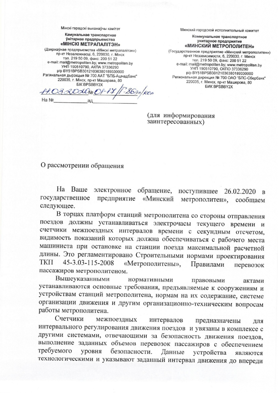 Предлагаем рассмотреть возможность того, чтобы часы, расположенные на станциях метрополитена, показывали не когда поезд уехал, а когда приедет следующий! Спасибо большое!