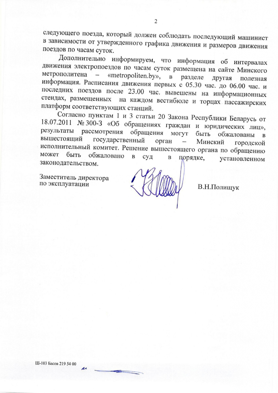 В торцах платформы станций метрополитена со стороны отправления поездов установлены электрочасы текущего времени счётчики межпоездных интервалов времени с секундным отсчётом. Информация об интервалах движения электропоездов по часам суток размещена на сайте Минского метрополитена, расписания движения первых с 05:30 до 06:00 час. и последних поездов после 23:00 вывешена на информационных стендах, размещённых в каждом вестибюле и в торцах пассажирских платформ станций.