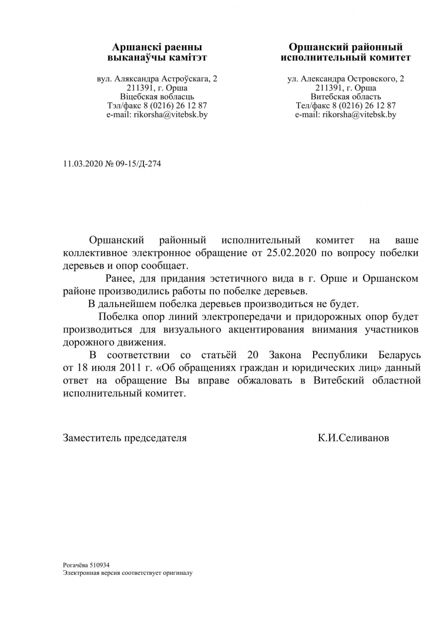 На основании данного ответа, а также исходя из здравого смысла, мы, нижеподписавшиеся, требуем немедленно прекратить побелку деревьев и придорожных столбов в Орше. Требуем прекратить нерациональное использование городского бюджета, который пополняется за счёт налогоплательщиков г.Орша.