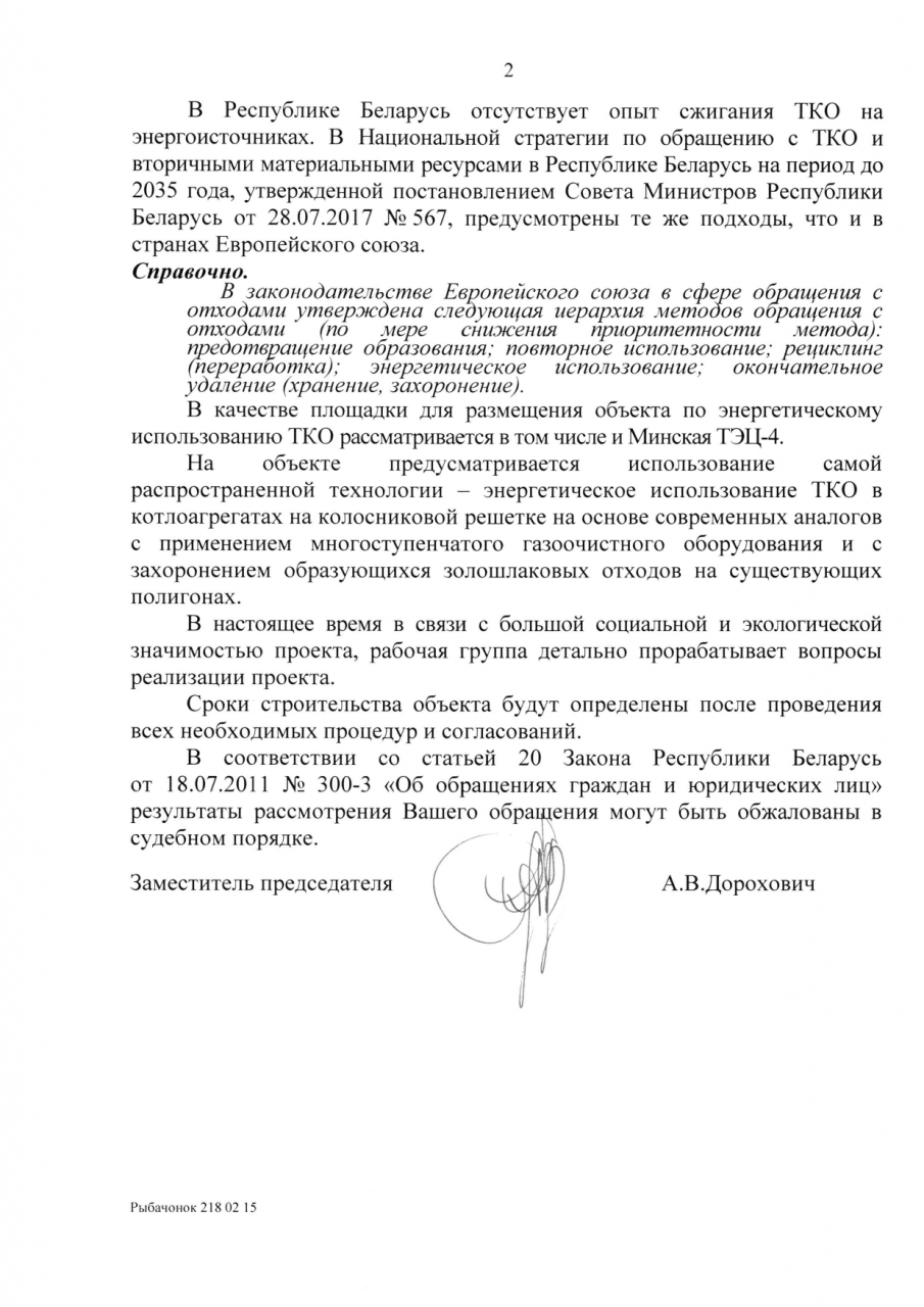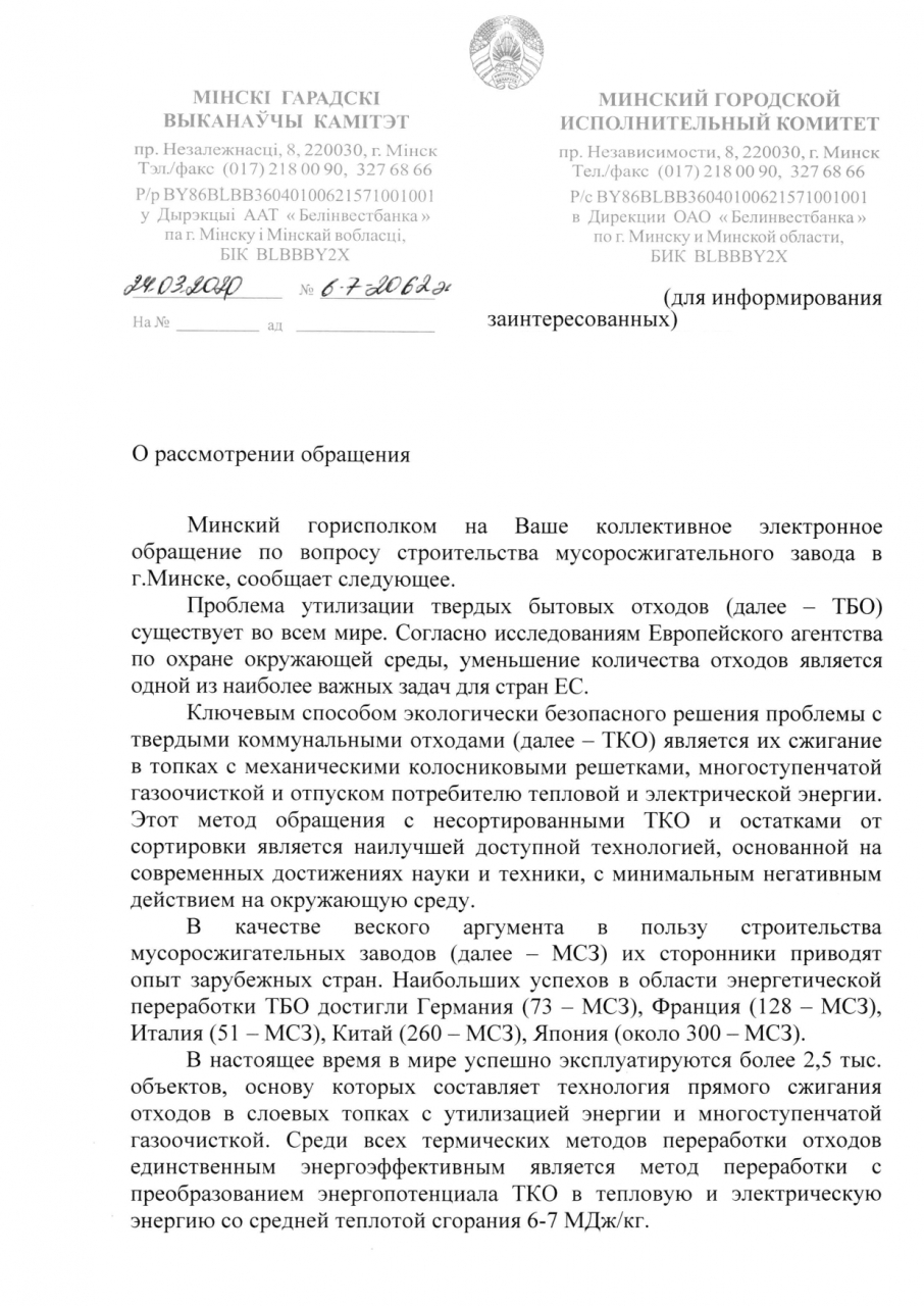 В качестве площадки размещения объекта по энергетическому использованию ТКО рассматривается в том числе Минская ТЭЦ-4. В настоящее время рабочая группа детально прорабатывает вопросы реализации проекта. Сроки строительства объекта будут определены после проведения всех необходимых процедур и согласований.