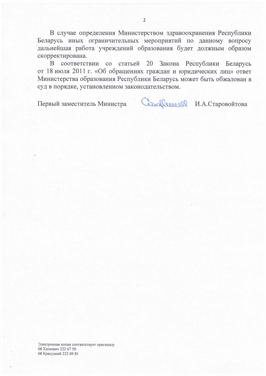 Учреждениями образования осуществляется оперативная связь с территориальными организациями здравоохранения и территориальными органами и учреждениями, осуществляющими государственный, санитарный надзор по вопросам профилактики инфекции, вызванной коронавирусом 2019-nCoV, в том числе, в отношении китайских студентов, прибывающих в Республику Беларусь.