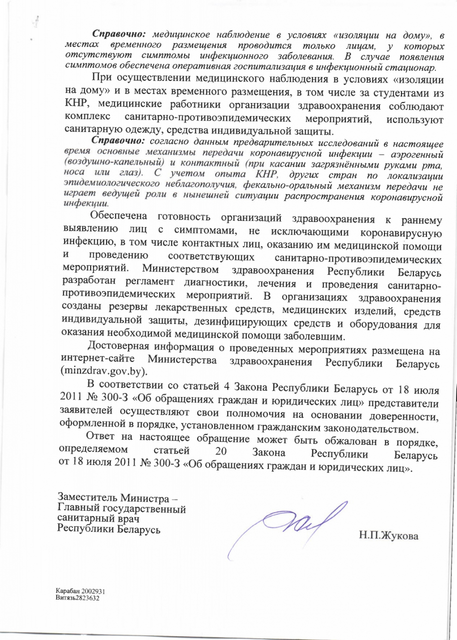 С декабря месяца КНР пытается стабилизировать ситуацию, несмотря на предпринятые массовые меры, карантин, задействованные огромные человеческие и финансовые ресурсы, вирус продолжает распространение и охватил все регионы Китая, смертность растет, продолжают погибать пациенты, заражённые ещё в начале января. Также было объявлено, что иммунитет не вырабатывается и возможно повторное заражение. Мы не желаем подвергать подобной опасности себя и свои семьи. Мы выступаем против принятия ещё около 700 китайских студентов до стабилизации ситуации. Кроме того, как было отмечено Министром здравоохранения Республики Беларусь, студенты, прибывшие из Китая, находятся не на карантине, а "под наблюдением" в специально отведенных местах, а те институты, которые на две недели могут предоставить вернувшимся студентам помещения с отдельным входом, забирают их к себе. То же самое касается китайцев, которые трудятся на белорусских предприятиях. Таким образом, данные лица, а также работники здравоохранения, которые обслуживают китайских студентов, находящихся "под наблюдением", свободны в перемещении и распространении вируса в нашей стране, что неприемлемо и угрожает здоровью и жизни населения Республики Беларусь.