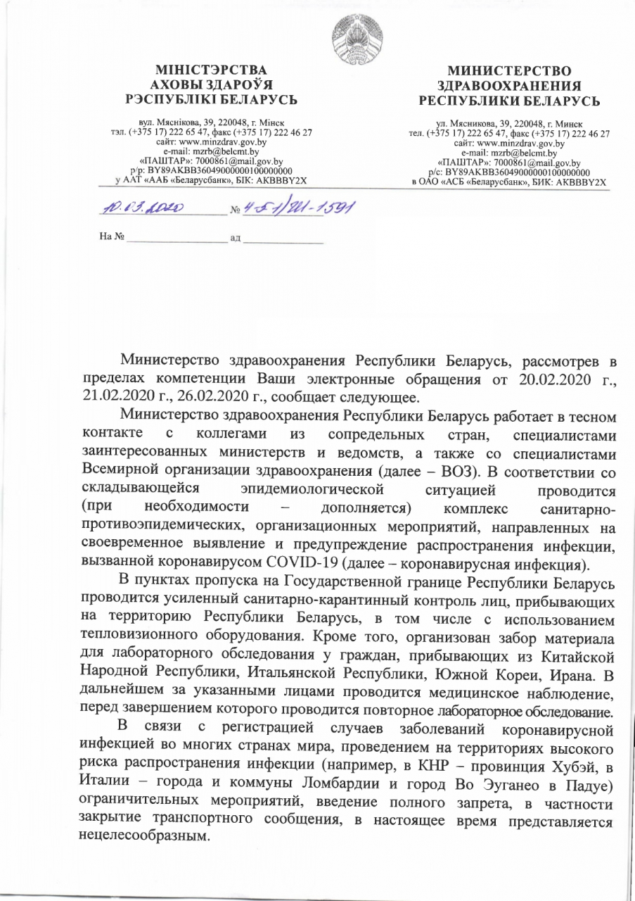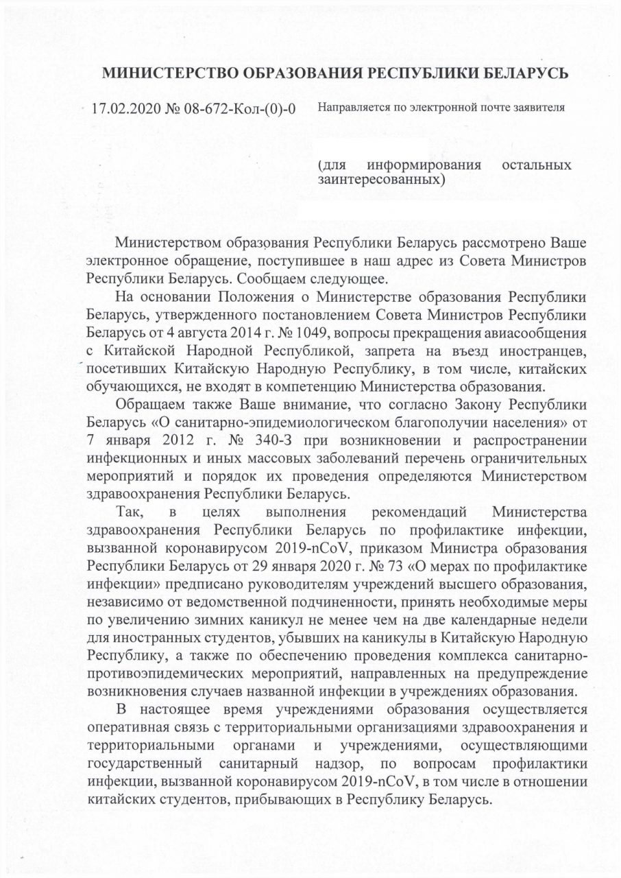 Требуем прекращения авиасообщения с КНР, а также тотального запрета на въезд иностранцев, посетивших КНР, в том числе, студентов-граждан Китая, обучающихся в Республике Беларусь и находящихся на данный момент на каникулах в КНР.
