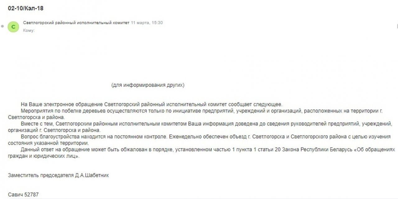 Мероприятия по побелке деревьев осуществляются только по инициативе предприятий, учреждений и организаций, расположенных на территории г.Светлогорска и района. Светлогорским райисполкомом информация, изложенная в обращении, доведена до сведения руководителей предприятий, учреждений, организаций г.Светлогорска и района.