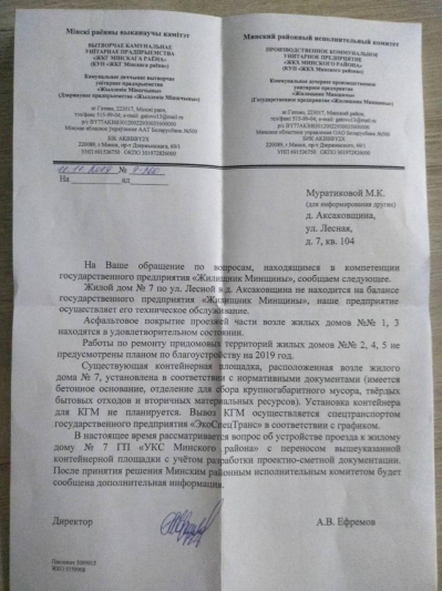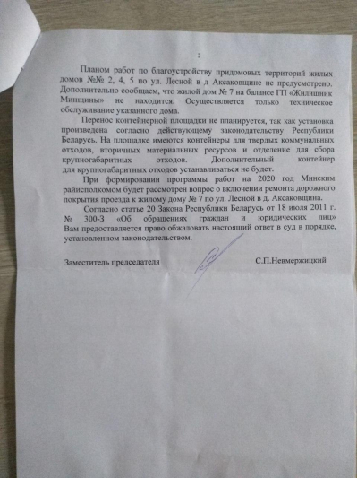 После многочисленных коллективных обращений в местные структуры управления и нескольких личных приемов, в план работ ГП "УКС Минского р-на" на 2020 год включены проектно-изыскательные работы на строительство подъездной дороги к контейнерной площадке - этот участок дороги между детским садом и 120 квартирным домом находится в самом "плачевном" состоянии. Жители заявили о том, что готовы и сами принять участие в восстановлении этого участка дороги. Но в плане нет ни строительства дороги, ни ее ремонта, в то время как требуются срочные меры решения проблемы.