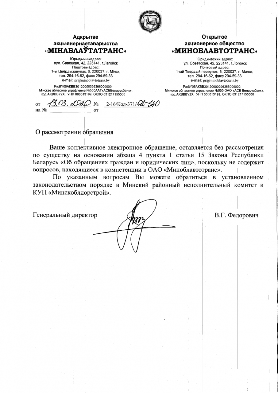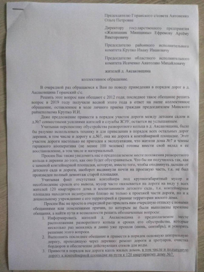1. Последнее коллективное обращение в районный и областной исполнительные комитеты, сельский совет и директору ГП "Жилищник Минщины".