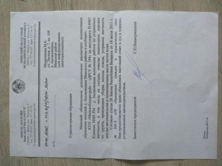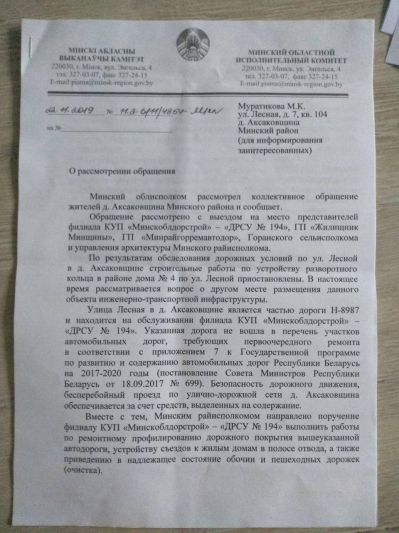 Учитывая выше изложенное, во избежание ненужных, уже имеющих место быть травм, с целью обеспечения безопасности движения транспортных средств и права безопасного передвижения пешеходов просим Минжилкомхоз Республики Беларусь изыскать средства с привлечением внебюджетного финансирования на восстановление дорог д. Аксаковщина, ул. Лесная, в соответствие с существующими нормативными актами (перечень нормативных документов прилагается в прикрепленных к настоящему обращению документах).