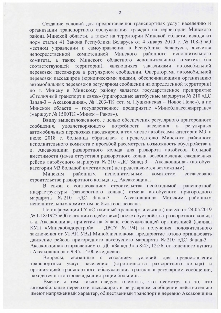 4. Изыскать и выделить средства на обустройство разворотного кольца в д. Аксаковщина на должном уровне, с учетом пожеланий местных жителей, в том числе и жителей истинной д. Аксаковщина, с которой на данный момент нет транспортного сообщения, с ремонтом дороги по которой предполагается движение пригородного автобуса и восстановлением тротуара.