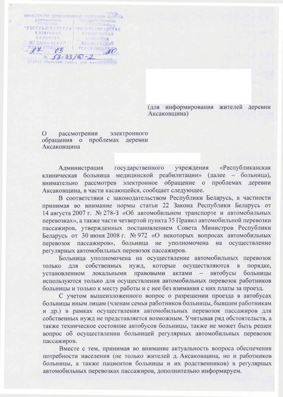 Просим учесть тот факт, что изначально населенный пункт обустраивался как поселок для обслуживающего персонала санатория МЗ, затем больницы и всегда потребность населения в транспортных услугах решалась через использование служебного транспорта этих учреждений местными жителями по льготным условиям.