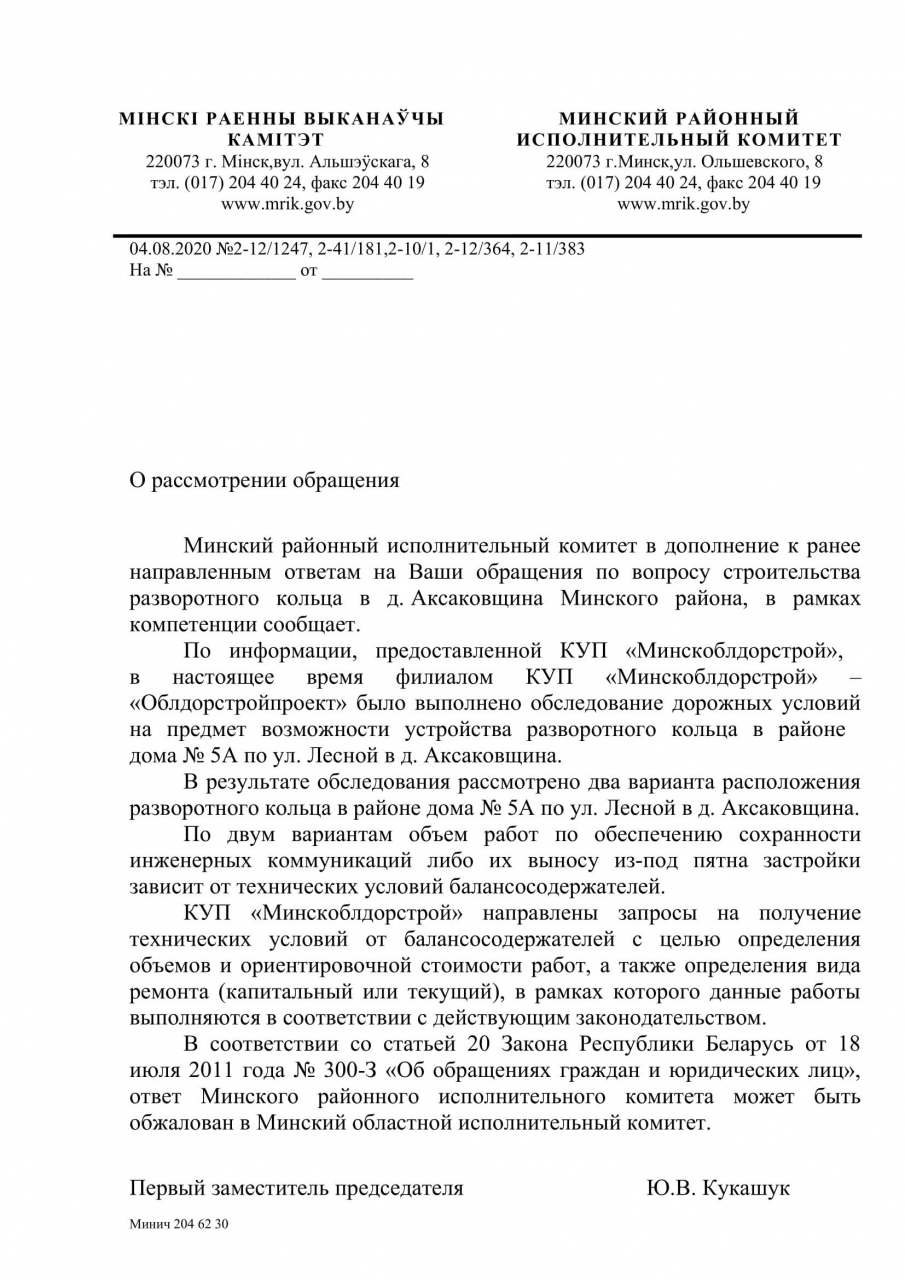 КУП «Минскоблдорстрой» направлены запросы на получение технических условий от балансосодержателей с целью определения объёмов и ориентировочной стоимости работ по устройству разворотного кольца в районе дома №5А по ул.Лесной в д.Аксаковщина, а также определения вида ремонта (капитальный или текущий), в рамках которого данные работы выполняются в соответствии с действующим законодательством.