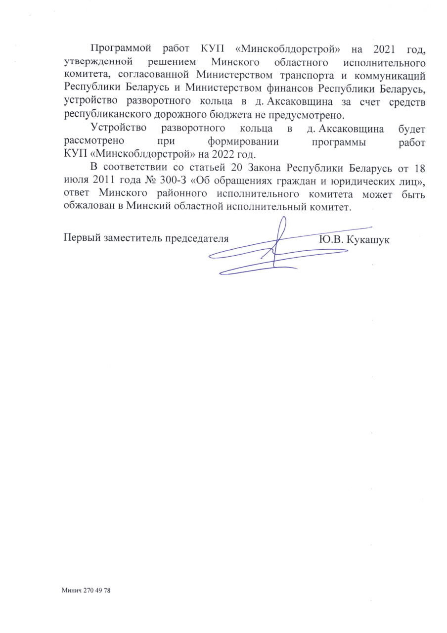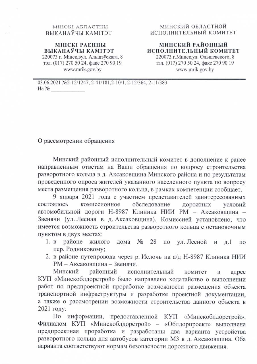 UPD. Устройство разворотного кольца дер.Аксаковщина будет рассмотрено при формировании программы работ КУП "Минскоблдорстрой" на 2022 г.