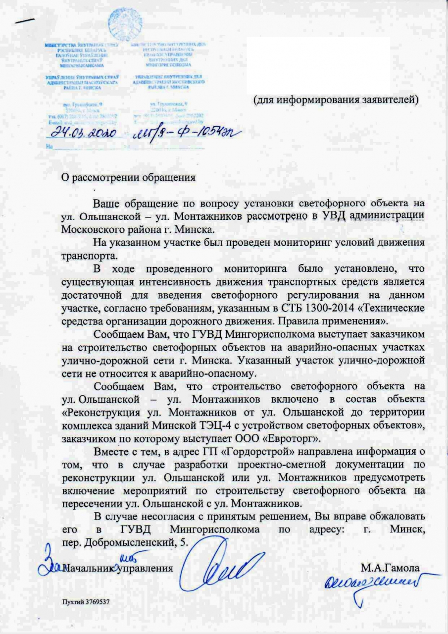 Таким образом, учитывая, что пп.17.7 п.17 Положения о Государственной автомобильной инспекции Министерства внутренних дел Республики Беларусь в качестве одной из функций ГАИ предусмотрено изучение условий дорожного движения, принятие мер к совершенствованию организации движения транспорта и пешеходов, согласование в установленном порядке проектов организации дорожного движения в городах и на дорогах, требуем установить светофор на указанном участке дороги.