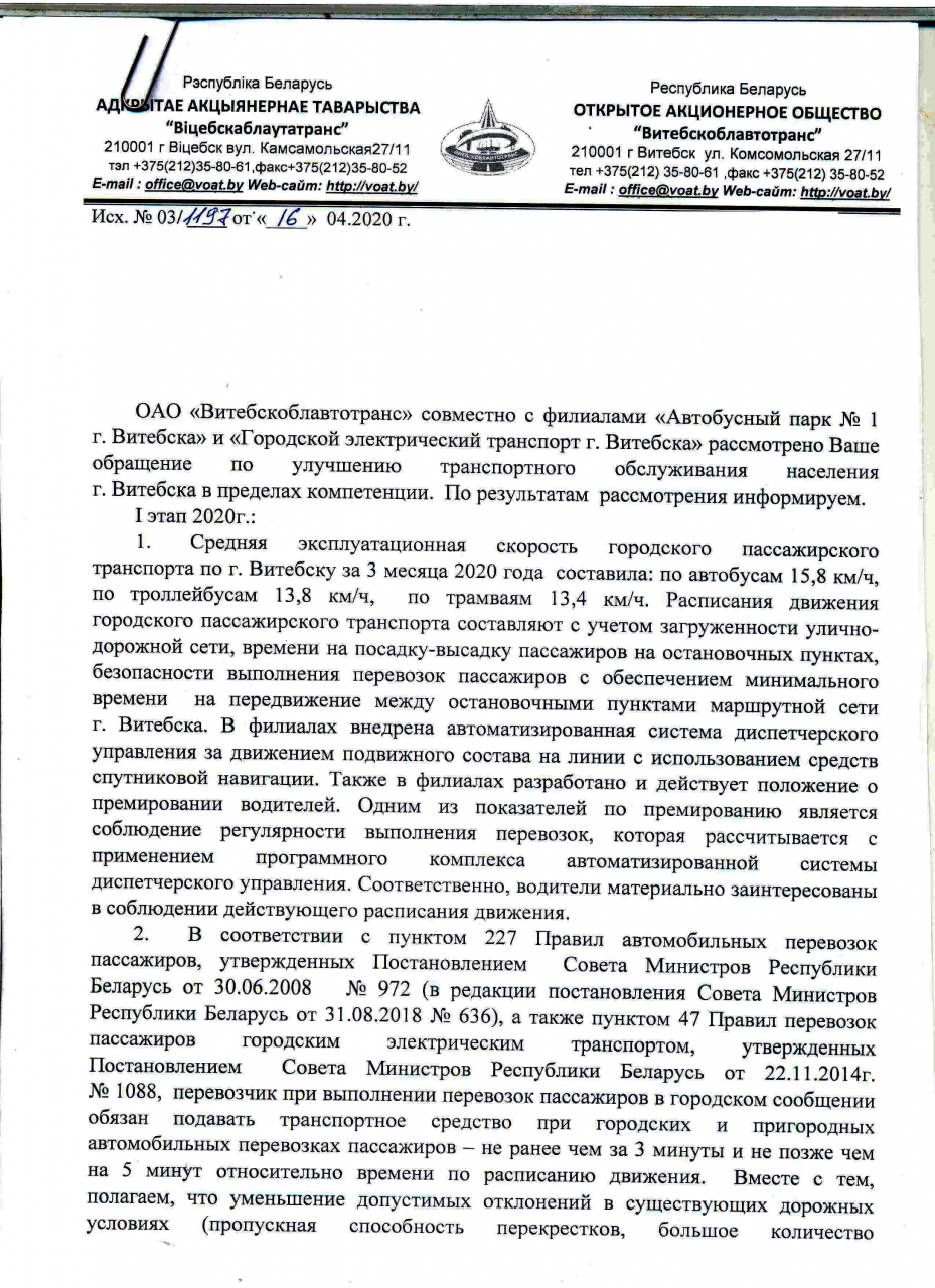 1. На данный момент средняя скорость движения общественного транспорта (далее – ОТ) в Витебске крайне низкая, по нашим данным, лишь немного превышает 13,5 км/ч – это значительно меньше таковой в загруженных пробками Варшаве или Минске. При этом, по наблюдениям первого в списке заявителя, очень часто водители специально вынуждены снижать скорость, останавливаться на перекрестках даже при разрешающем сигнале светофора, чтобы не опережать график. Уверены, что мощность двигателей ОТ и дорожная обстановка нашего города позволяет пересмотреть расписания движения и увеличить среднюю скорость обращения для каждого маршрута минимум на 1 км/ч. Ведь при 100 млн. перевезенных пассажирах в год каждая сэкономленная минута – это почти 200 сохраненных лет жизни!