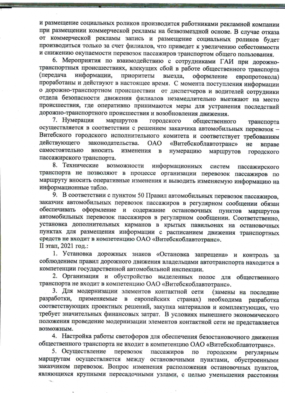 3. Необходимо произвести оптимизацию маршрутов и расписания движения ТС. Так, неприемлемыми являются ситуации, когда автобусы маршрута №10, полностью вписанного в маршрут №14, едут практически одновременно (с разницей 5-10 минут) с автобусами маршрута 14, после чего ни первых, ни вторых нет в течение 40 минут. Изменения назрели и на других маршрутах, причем не только в расписании движения транспорта, но и в прохождении маршрутов по городу, расположению остановок и т.п. Считаем, что оптимизацию следует заказать у компетентных организаций, к примеру, у филиала БНТУ «Научно-исследовательский политехнический институт», проведшего в 2018 г. исследование для городов Полоцк и Новополоцк. Также особое внимание просим уделить трамваю как самому экологичному и вместительному виду транспорта. Следует приложить усилия для того, чтобы трамвайное движение, ныне вытесненное на периферию, было органично вписано в транспортную систему города.