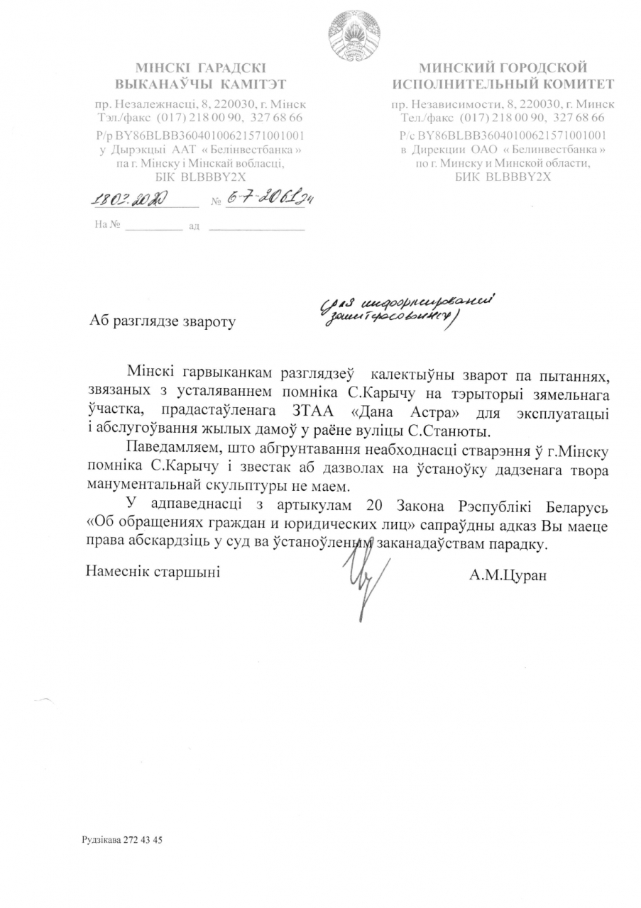 Абгрунтавання неабходнасці стварэння ў Мінску помніка С.Карычу і звестак аб дазволах на ўстаноўку дадзенага твору манументальнай скульптуры Мінгарвыканкам не мае.
