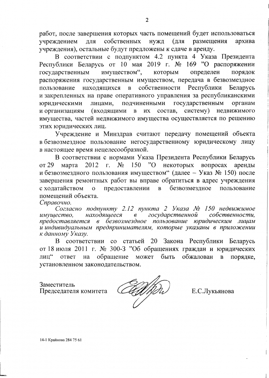 UPD. Передача помещений в безвозмездное пользование негосударственному юридическому лицу в настоящее время нецелесообразна. Однако после завершения ремонтных работ заявители вправе обратиться в адрес ГУ "Республиканская клиническая больница медицинской реабилитации" с ходатайством о предоставлении в безвозмездное пользование помещений капитального строния №600/С-117616.