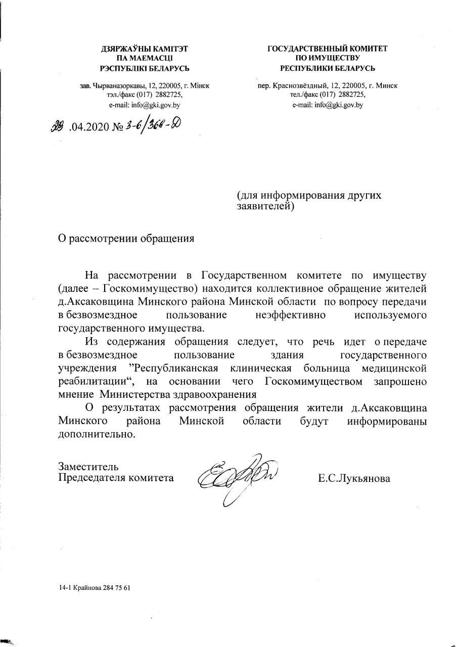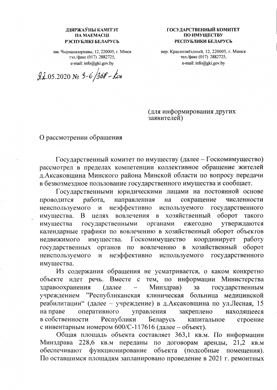 Просим Минский райисполком и Совет депутатов ходатайствовать, а Государственный комитет по имуществу решить вопрос о передаче неэффективно используемого имущества, находящегося в собственности Республика Беларусь в безвозмездное пользование негосударственному юридическому лицу: частному социально-информационному учреждению устойчивого регионального развития «Источник возможностей» для создания актуального социально значимого объекта на селе.