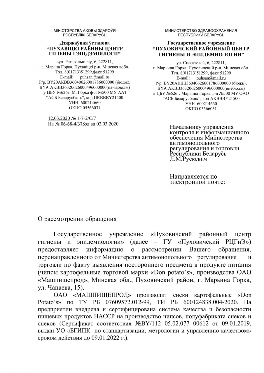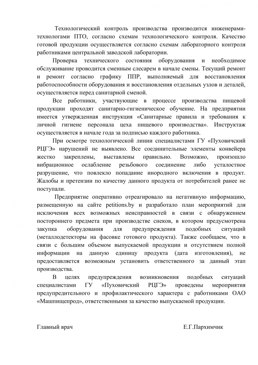 Предприятие «Машпищепрод» оперативно отреагировало на негативную информацию, размещенную на сайте petitions.by и разработало план мероприятий для исключения всех возможных неисправностей в связи с обнаружением постороннего предмета при производстве снеков. В целях предупреждения возникновения подобных ситуаций специалистами ГУ «Пуховичский РЦГЭ» проведены мероприятия предупредительного и профилактического характера с работниками ОАО «Машпищепрод», ответственными за качество выпускаемой продукции.