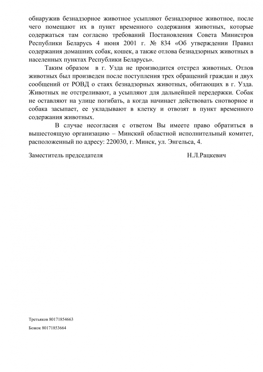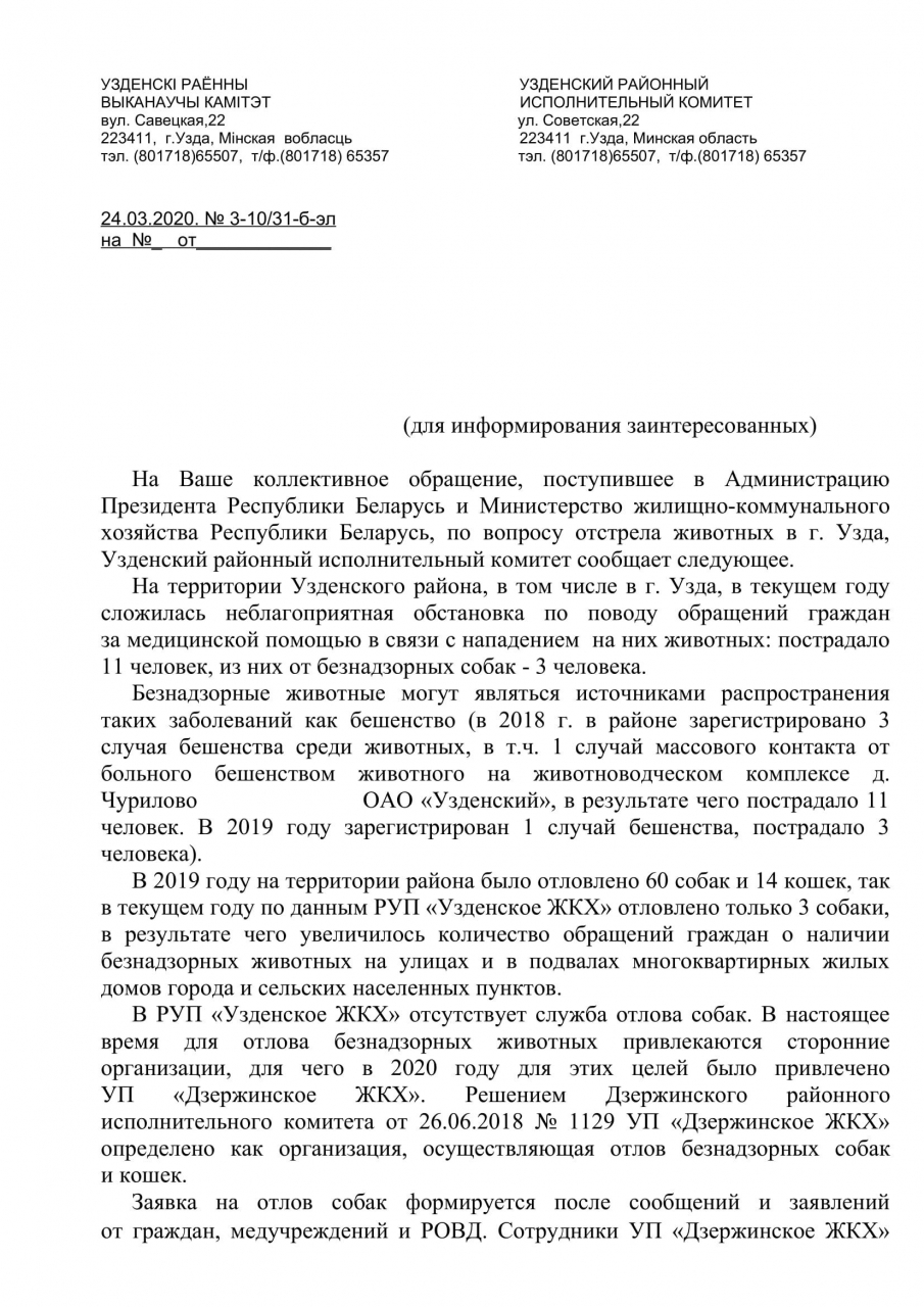 В г.Узда не производится отстрел животных. Отлов животных был произведен после поступления трех обращений граждан и двух сообщений от РОВД о стаях безнадзорных животных, обитающих в г.Узда. Животных не отстреливают, а усыпляют для дальнейшей передержки. Собак не оставляют на улице погибать, а когда начинает действовать снотворное и собака засыпает, ее укладывают в клетку и отвозят в пункт временного содержания животных.