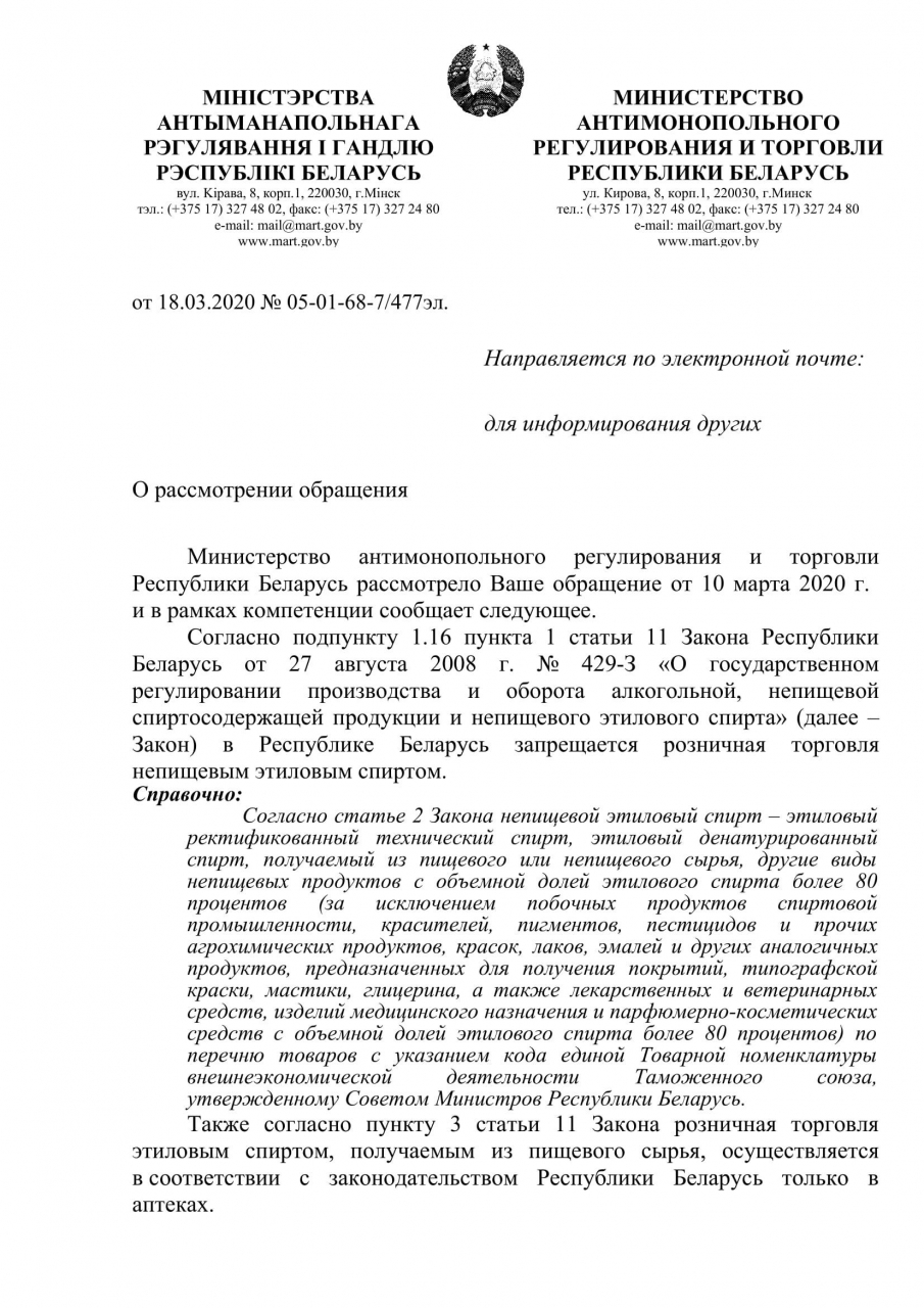 Ввиду того, что вокруг страны с каждым днём фиксируется всё большее число заболевших и заразившихся опасным инфекционным заболеванием -- каронавирусной пневмонией, ходатайствуем о возвращении в розничную продажу этилового спирта крепостью 96%.