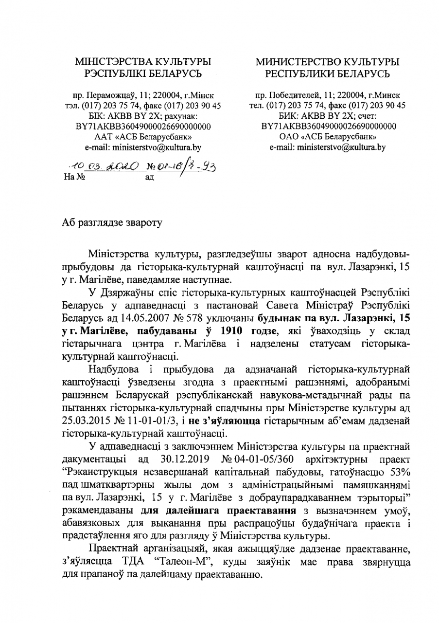 У сувязі з правядзеннем грамадскіх абмеркаванняў справаздачы аб ацэнцы ўздзеяння на навакольнае асяроддзе па аб'екце: «Рэканструкцыя незавершанай закансерваванай капітальнай пабудовы, гатовасцю 53% пад шматкватэрны жылы дом з адміністрацыйнымі памяшканнямі па вул.Лазарэнкі,15 у г.Магілёве з добраўпарадкаваннем тэрыторыі», прашу Міністэрства культуры Беларусі патлумачыць, які юрыдычны статус мае надбудова-прыбудова да гісторыка-культурнай каштоўнасці, зробленая ў час, калі Навукова-метадычная рада незаконна (рашэнне пасля было скасаванае пракуратурай) пазбавіла гэтую часту вуліцы ахоўнага статусу па пранове Магілёўскага гарвыканкама і Магілёўскага аблвыканкама. Раней абласная рада Таварыства аховы помнікаў гісторыі і культуры выказвала занепакоенасць тым, што надбудова павялічыла нагрузку на сцены, у выніку па іх пайшлі трэшчыны, а таксама, што ўласнік не ўмацоўваў падмурак. У 2015 годзе Міністэрства культуры спыніла будаўніцтва ў сувязі з аднаўленнем ахоўнага статусу аб'екта, але цяпер будаўніцтва ў тым жа аб'ёме чамусьці плануецца працягнуць.