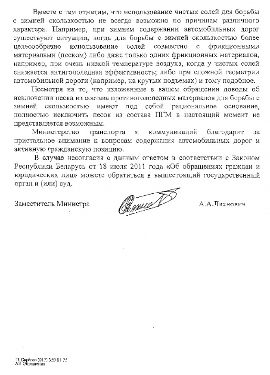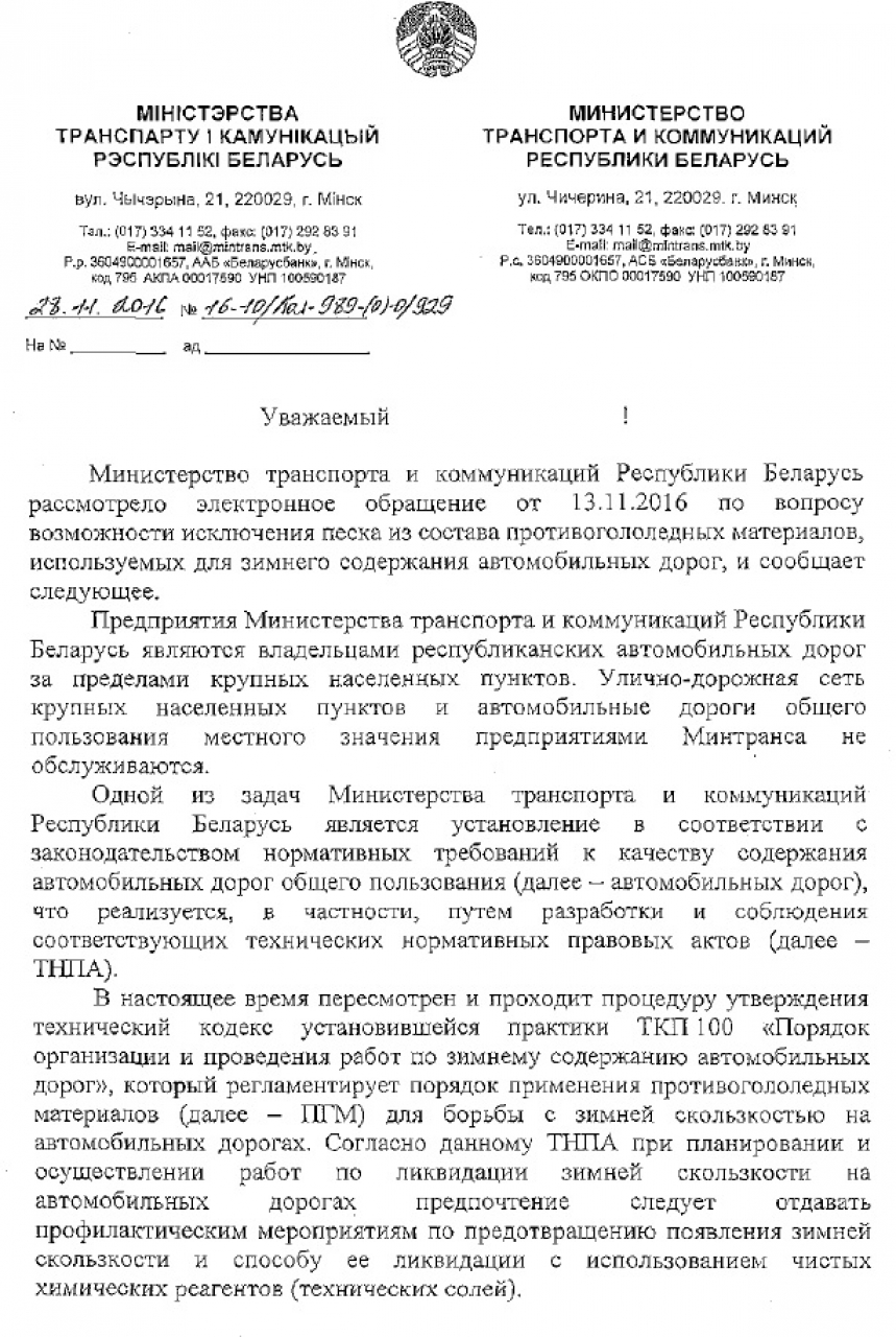 Предлагаем полностью исключить песок из состава антигололёдных реагентов, применяемых для борьбы со льдом на автодорогах в зимний период в Республике Беларусь.