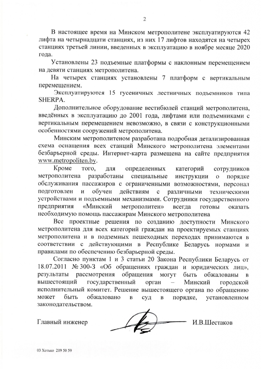 Просим оснатить все станции метро, подземные переходы лифтами и подъемными кабинами. Грустно видеть, как инвалиды с церебральным параличом, пожилые люди с проблемами опорно-двигательного аппарата, люди на костылях с трудом карабкаются по лестницам. Даже новые станции метро не оснащены лифтами на всех уровнях подъёма, а абсолютно невостребованные из-за неудобства в использовании подъёмные площадки в метро стоят без действия (а ведь на их обустройство и приобретение затрачены огромные средства, которые можно было потратить на лифты).