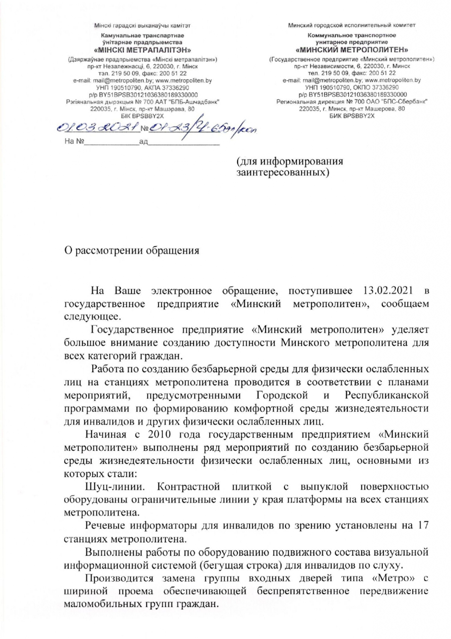 С 2010 г. ГП "Минский метрополитен" выполнены ряд мероприятий по созданию безбарьерной среды жизнедеятельности физически ослабленных лиц. Все проектные решения по созданию доступности метрополитена для всех категорий граждан на проектируемых станциях и в подземных переходах принимаются в соответствии с действующими нормами и правилами по обеспечению безбарьерной среды.
