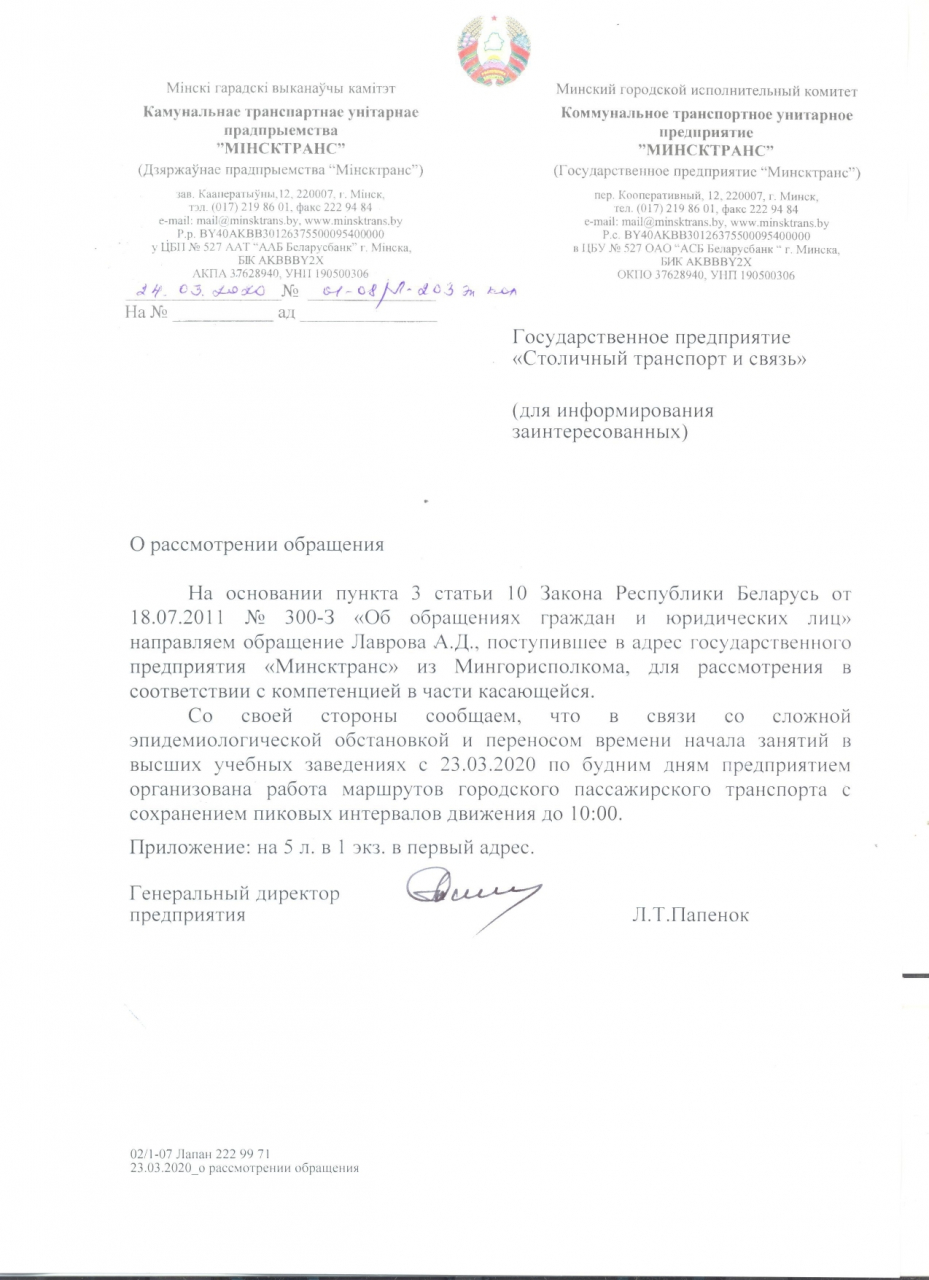 УП "Минсктранс" с 23 марта 2020 г. организована работа маршрутов городского пассажирского транспорта с сохранением пиковых интервалов движения до 10:00.