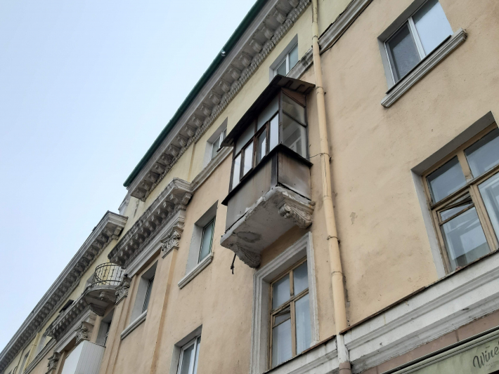 2) Зрэзаны балконы з ляпнымі кранштэйнамі, новыя балконы не маюць кранштэйнаў, а таксама прафіліроўкі тарцоў, відавочна, што агароджа таксама не адпавядае аўтэнтычнай. Паўкруглыя балконы на чацвёртым паверсе замены на прамавугольныя;