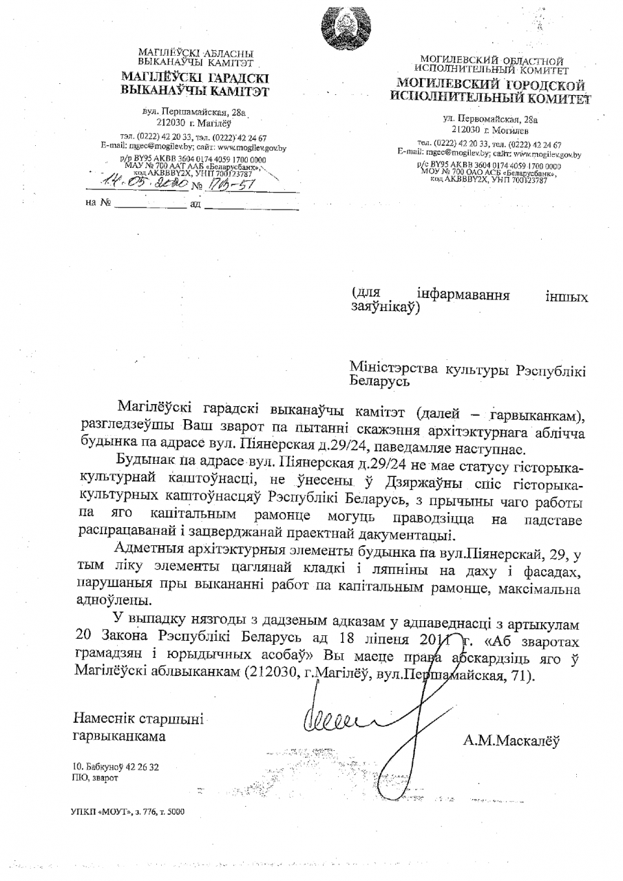 Работы на аб’екце «Капітальны рамонт жылога дома № 29 па вуліцы Піянерскай у г. Магілёве» вядуцца падраднай арганізацыяй КУП «ЖРЭУ Ленінскага раёна г.Магілёва» у адпаведнасці з праектнай дакументацыяй, а адметныя архітэктурныя элементы будынка, парушаныя пры выкананні работ пры капітальным рамонце, будуць адноўлены пры спрыяльных умовах надвор’я, у тэрмін да 01.05.2020.