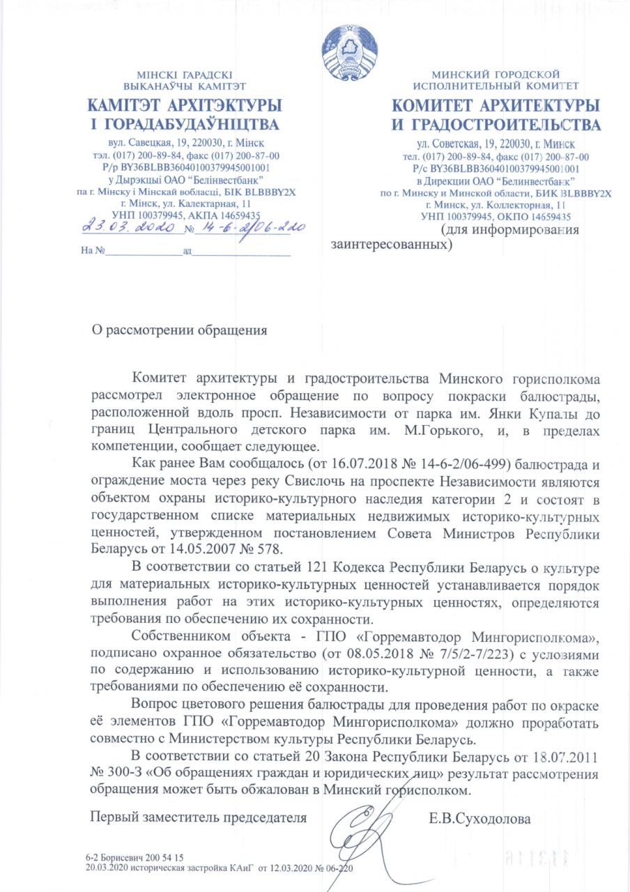 Вопрос цветового решения балюстрады для проведения работ по окраске её элементом ГПО "Горремавтодор Мингорисполкома" должно проработать совместно с Минкультом.