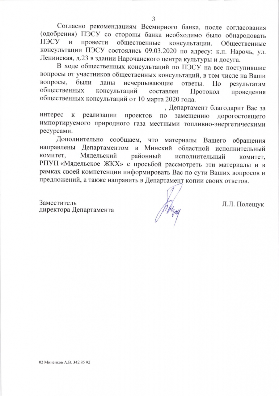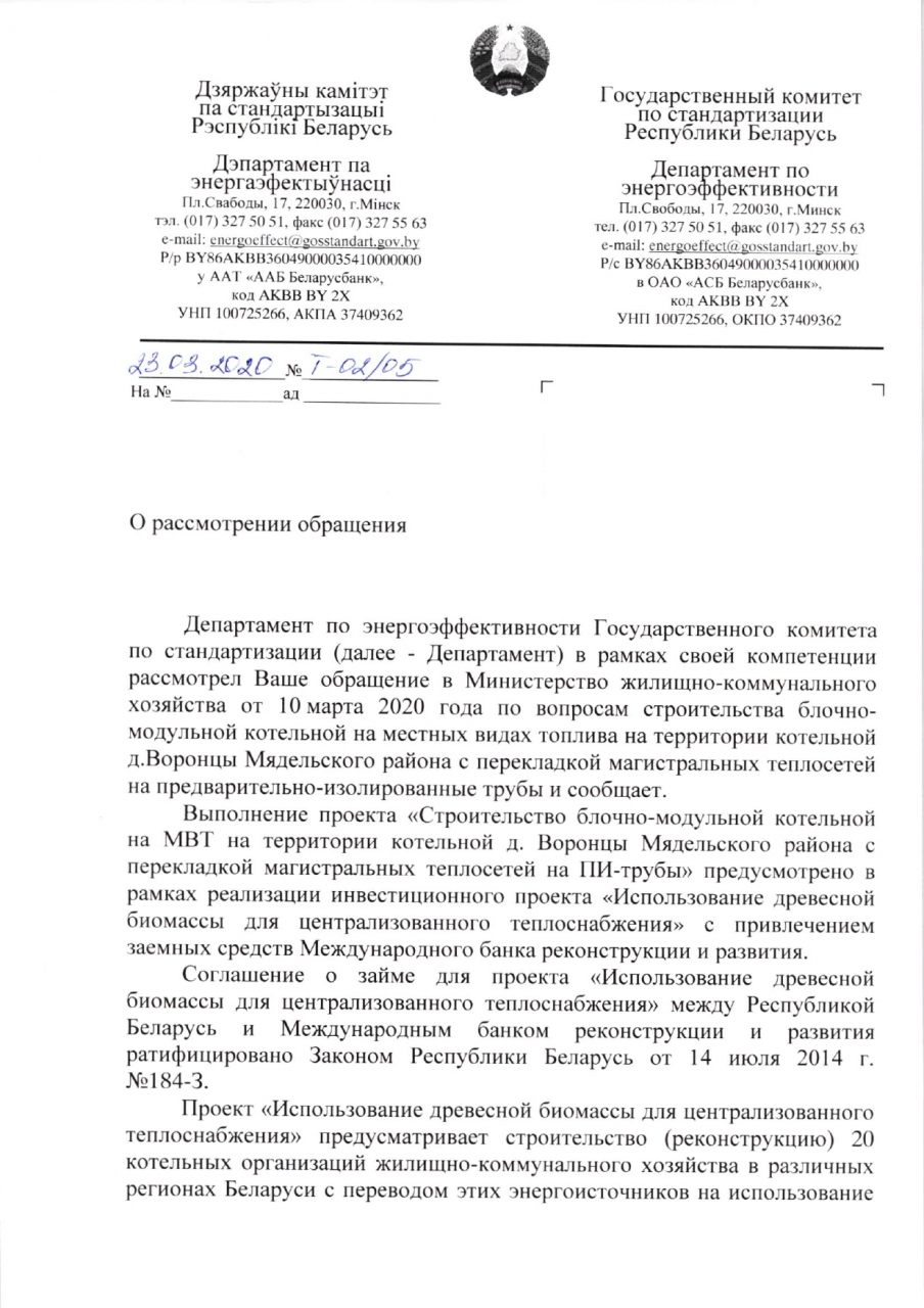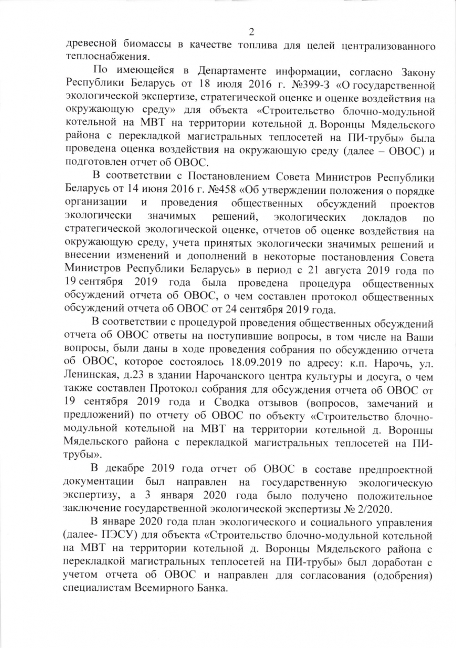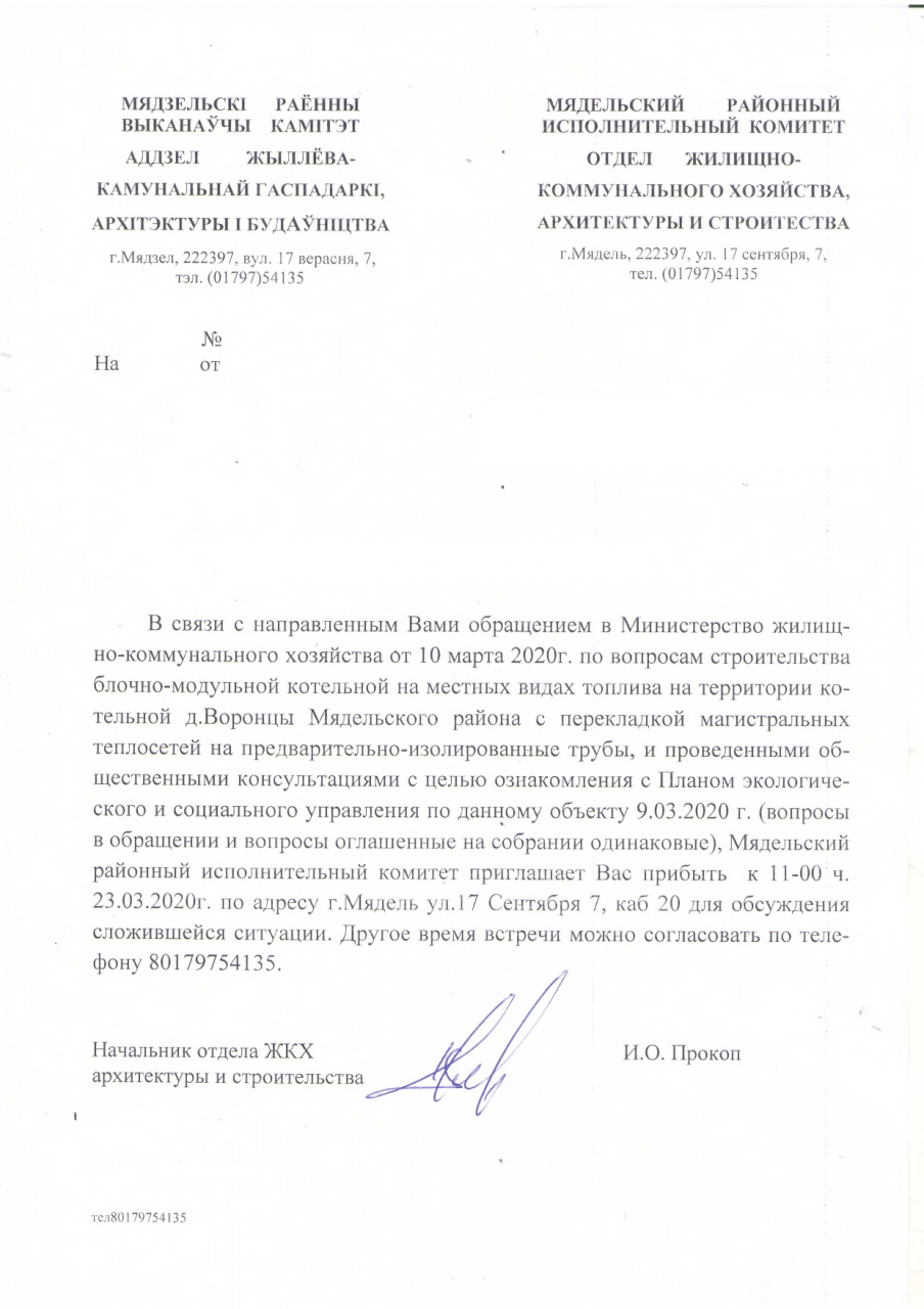 Просим рассмотреть вопросы (список прилагается) и предложения в связи с объявлением о проведении общественных консультаций с целью ознакомления с Планом экологического и социального управления по объекту «Строительство блочно-модульной котельной на МВТ на территории котельной д.Воронцы Мядельского района с перекладкой магистральных теплосетей на ПИ трубы»,