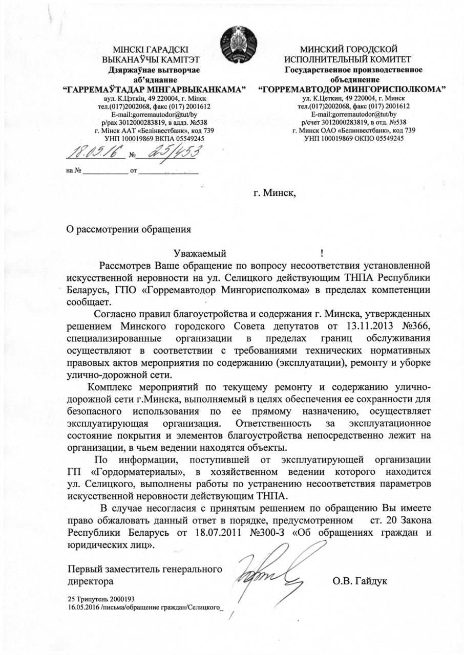 Летом 2015 года на улице Cелицкого установили лежачий полицейский, который не соответствует ГОСТ. Высота искусственной неровности должна быть не больше 6,5 см, угол ската 30 градусов. То, что фактически установили, этим требованиям не соответствует. Разбиваются подвески, лично у меня за время нахождения искусственной неровности два раза выходили из строя опорные подшипники, создаются пробки, потому что без проблем переехать это препятствие можно только на МАЗе. Прошу устранить несоответствие.