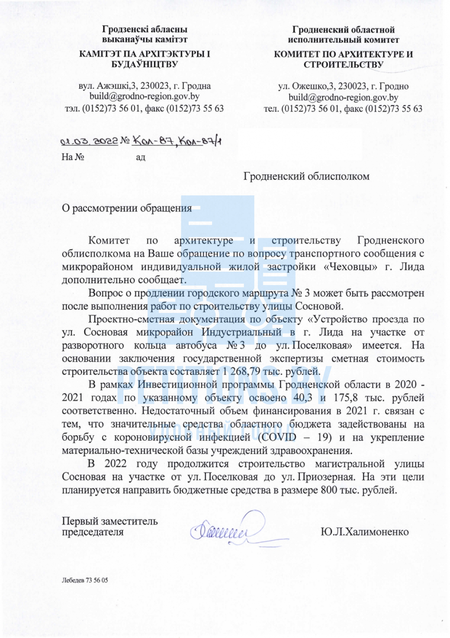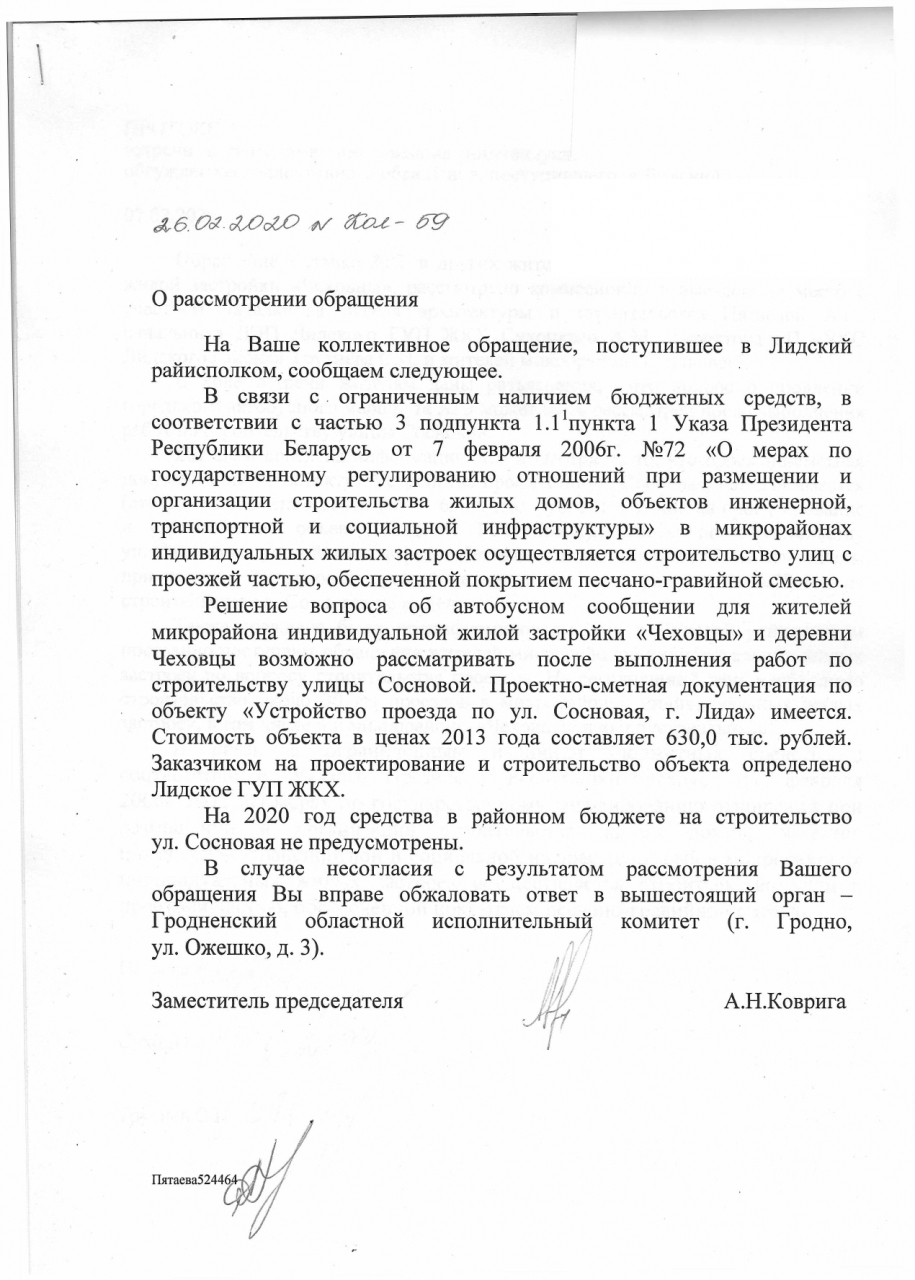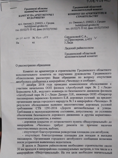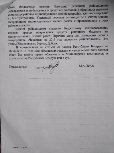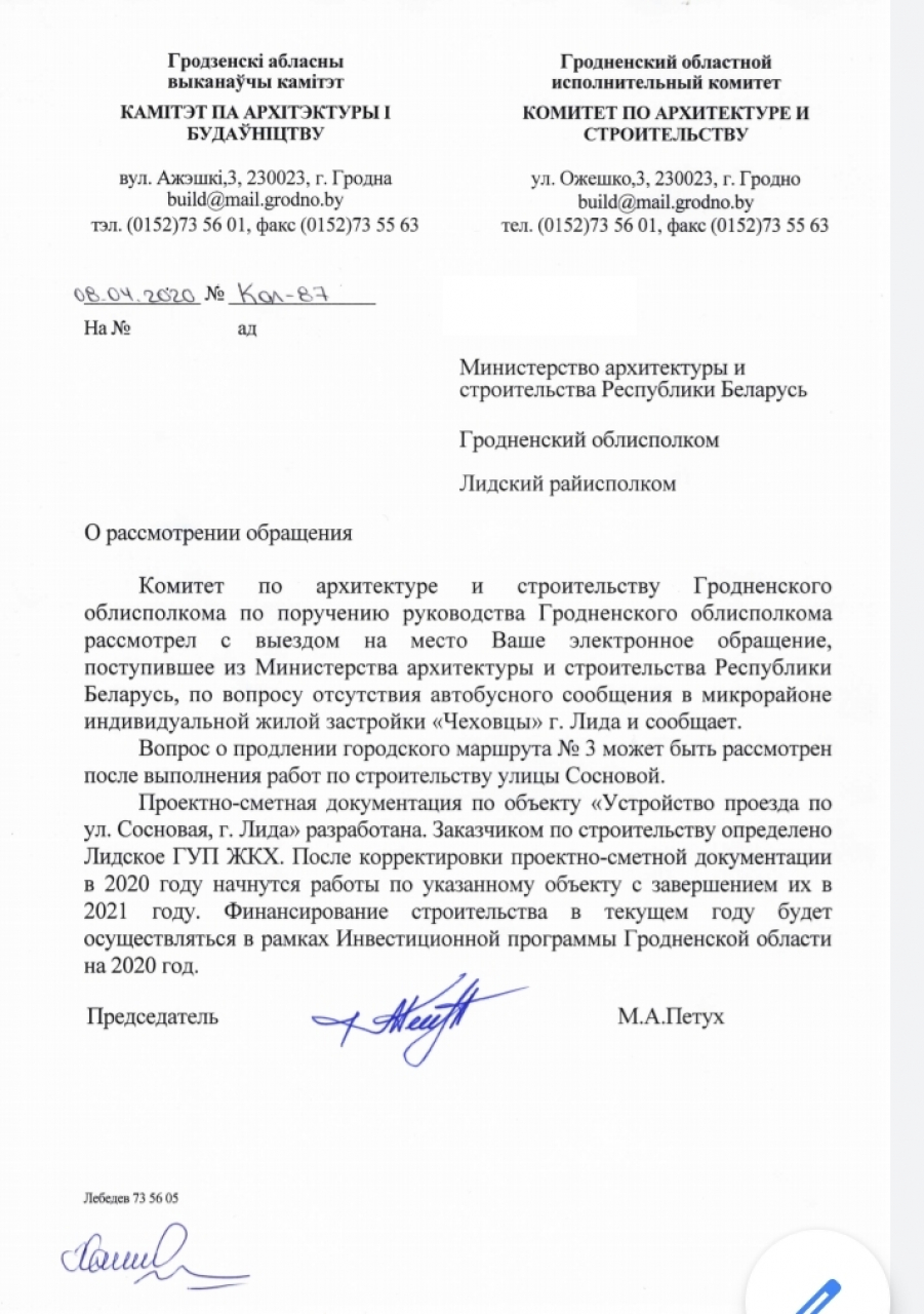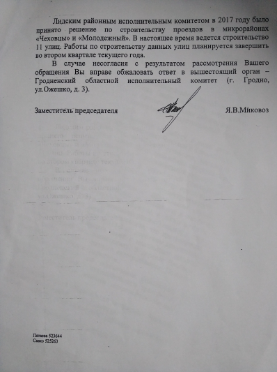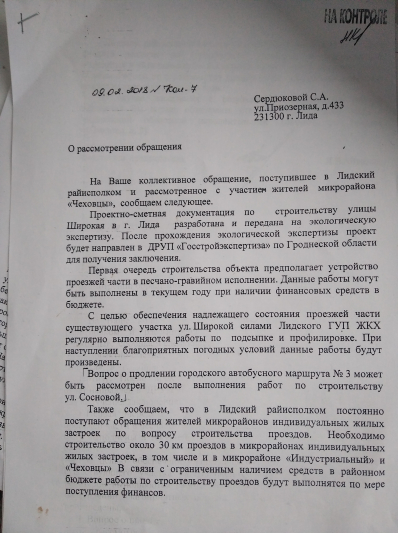 В течении нескольких лет, мы неоднократно обращались в местные органы власти, а так же в Гродненский облисполком (ответы о рассмотрении обращений прилагаются), однако наша проблема до сих пор остаётся открытой. В ответе Лидского районного исполнительного комитета указано, что в микрорайонах индивидуальных жилых застроек осуществляется строительство улиц с проезжей частью, обеспеченной покрытием песчано-гравийной смесью, однако мы обращались по поводу подъездной дороги к самому микрорайону, так как он находится на существенном расстоянии (более двух километров) от всех объектов социальной инфраструктуры и дорог с усовершенствованным покрытием. Для решения вопроса автобусного сообщения необходимо строительство ул.Сосновая, проектно-сметная документация на обустройство которой имеется уже давно. Просим Вас оказать содействие по вопросу строительства подъездной дороги, а также в организации автобусного сообщения к нашему микрорайону.