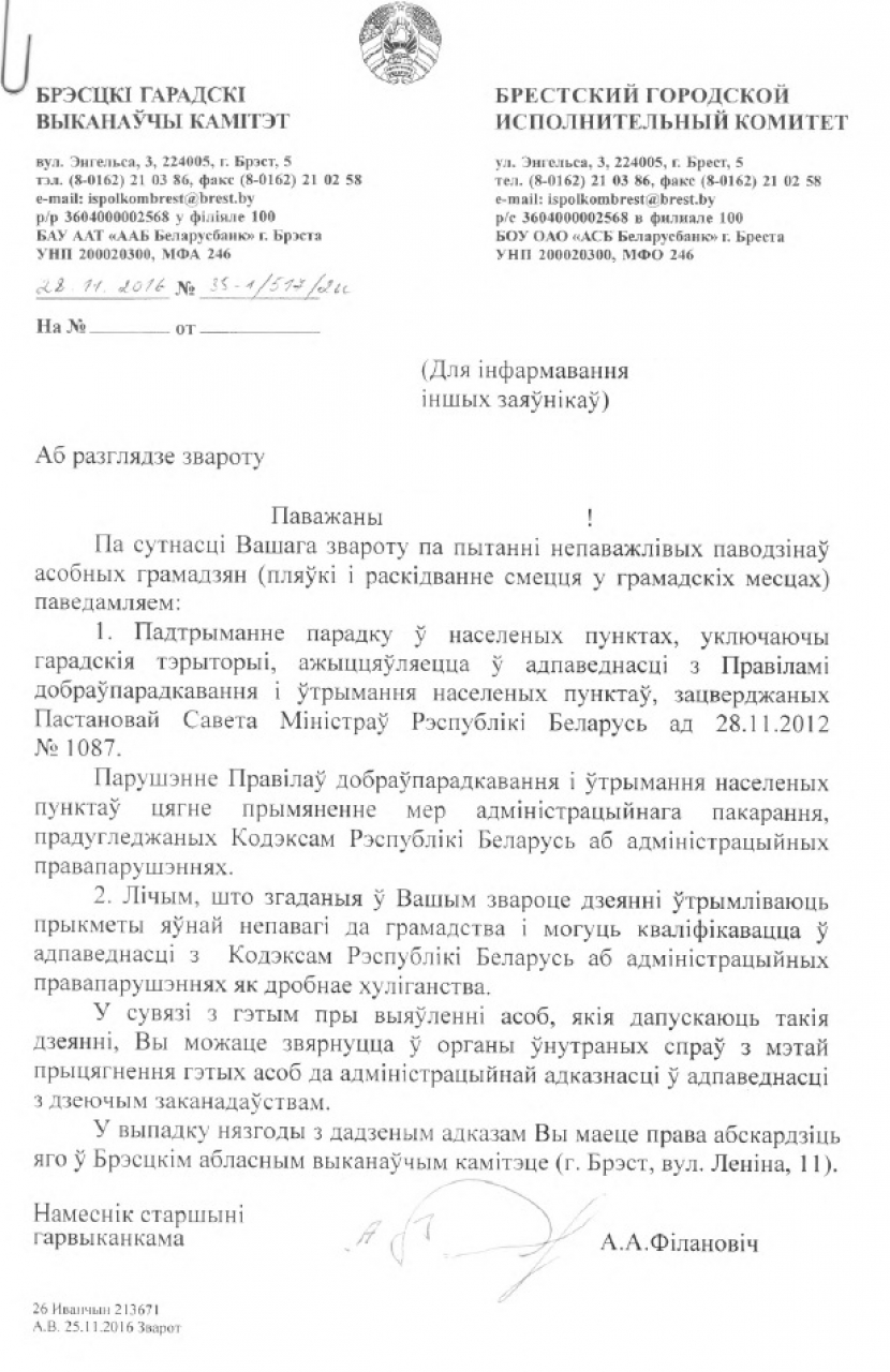 1. Просім разглядзець пытанне аб ўвядзенні пакарання ў выглядзе штрафу або арышту для грамадзян якія плююцца ў прысутнасці мінакоў, гэта значыць апаганьваюць месца агульнага карыстання, праяўляюць такім чынам непавагу да навакольных, парушаюць сваімі пляўкамі грамадскі парадак і спакой грамадзян.