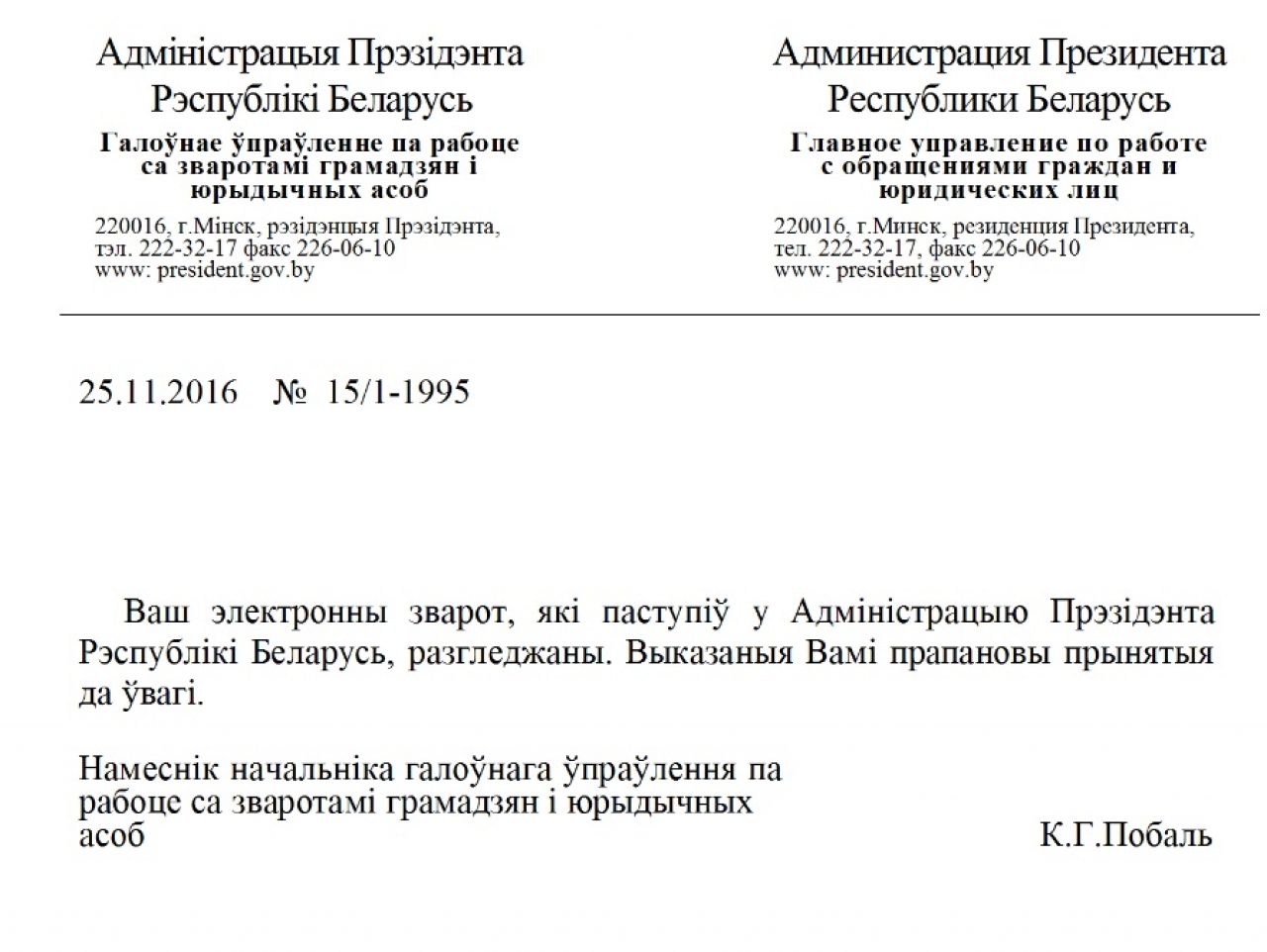 Адмiнiстрацыя Прэзiдэнта прыняла прапановы да ўвагi