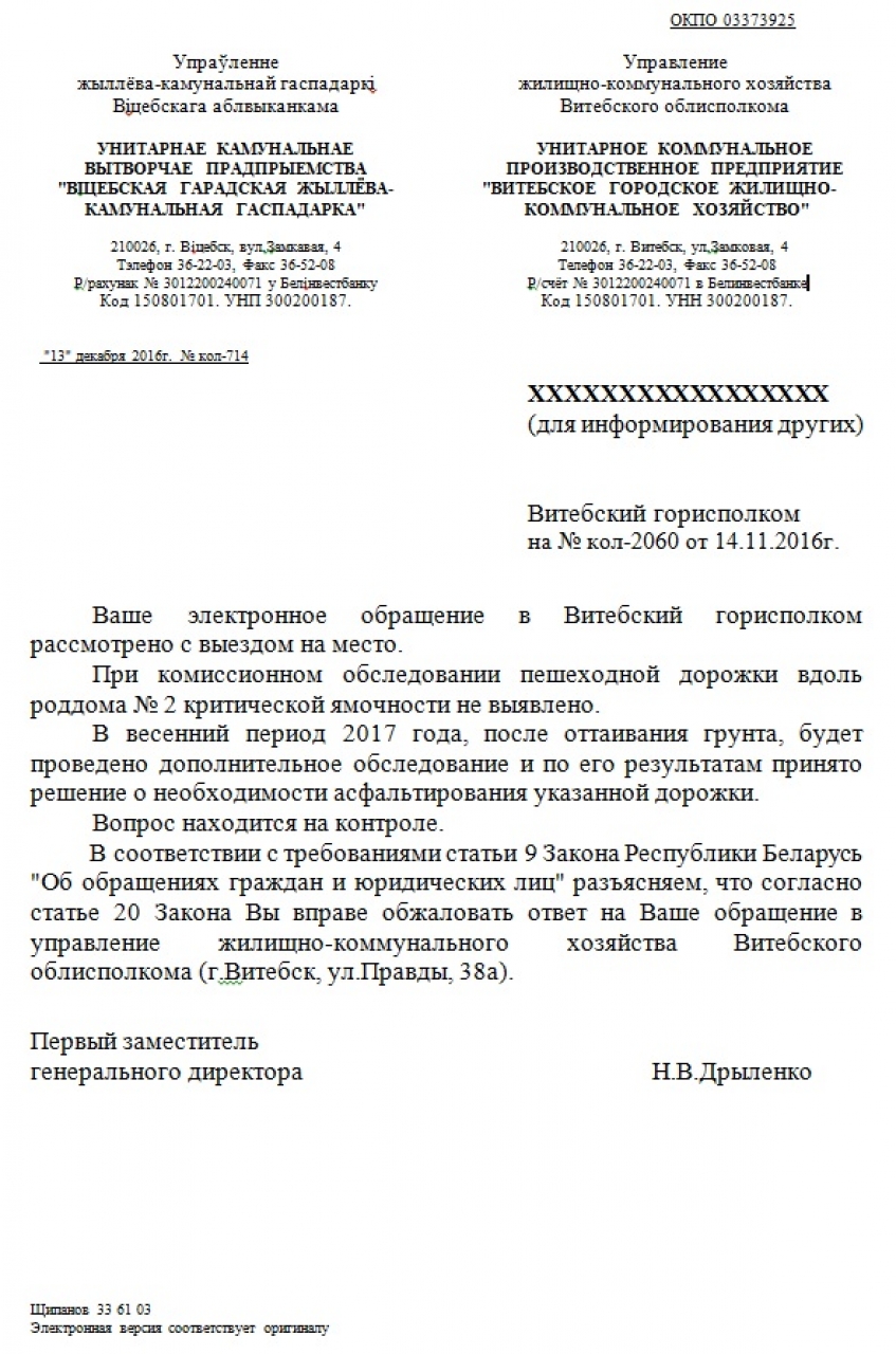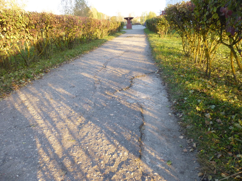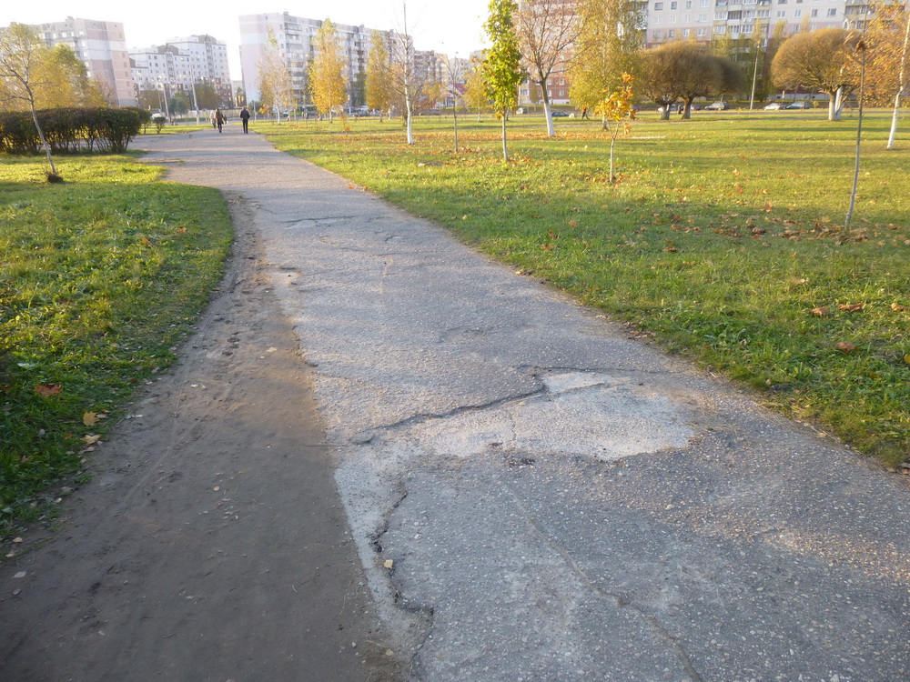 Поскольку вопросы управления дорожной деятельностью и благоустройства Законом "О местном управлении и самоуправлении в Республике Беларусь" отнесены к компетенции исполкомов, просим рассмотреть вопрос об укладке нового асфальта на пешеходных дорожках.