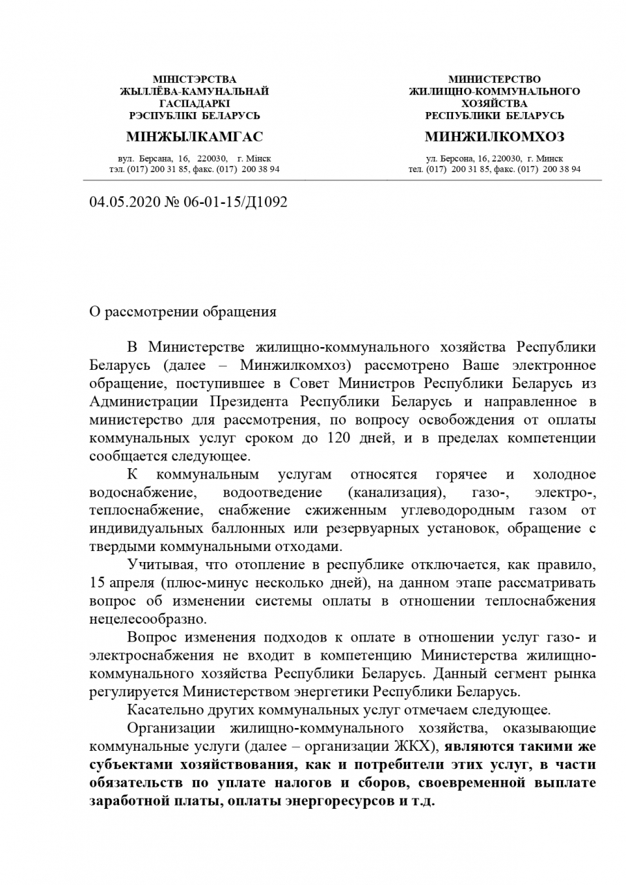 3. Способствовать введению каникул на уплату коммунальных услуг на срок до 120 дней с даты отмены ограничений, установленных республиканскими и местными органами власти в связи с распространением коронавирусной инфекции.