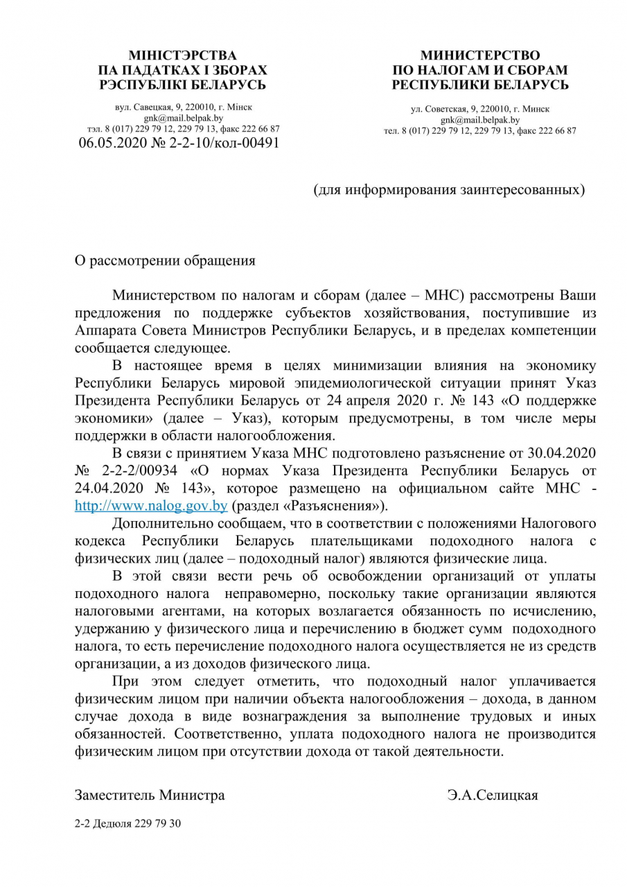 Указом Президента от 24.04.2020 № 143 «О поддержке экономики» предусмотрены, в том числе меры поддержки в области налогообложения. Вести речь об освобождении организаций от уплаты подоходного налога неправомерно, поскольку такие организации являются налоговыми агентами, на которых возлагается обязанность по исчислению, удержанию у физического лица и перечислению в бюджет сумм подоходного налога, то есть перечисление подоходного налога осуществляется не из средств организации, а из доходов физического лица.