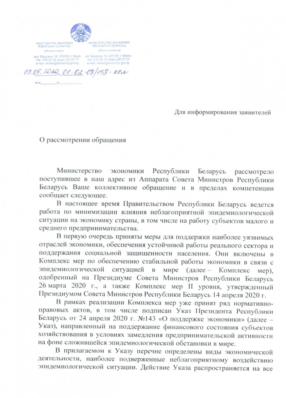Мы, представители индустрии общественного питания города Минска, обращаемся с просьбой оказать поддержку малому и среднему бизнесу, терпящему убытки в связи с ситуацией вокруг распространения коронавируса.
