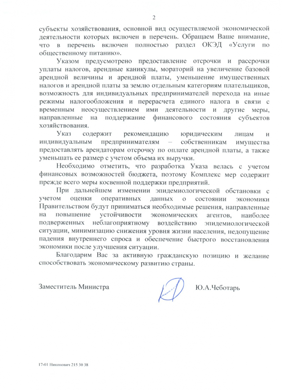 Действие Указа Президента от 24.04.2020 №143 "О поддержке экономики", направленного на поддержание финансового состояния субъектов хозяйствования в условиях замедления предпринимательской активности на фоне сложившейся эпидемиологической обстановки в мире распространяется полностью на раздел ОКЭД "Услуги по общественному питанию".