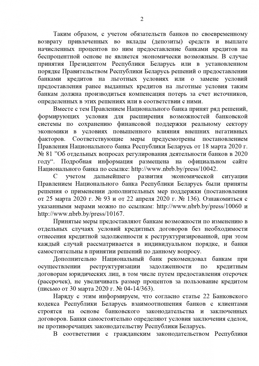 Предоставление банками кредитов на беспроцентной основе не является экономически возможным. Национальный банк рекомендовал банкам при осуществлении реструктуризации задолженности по кредитным договорам юридических лиц, в том числе путем предоставления отсрочек (рассрочек), не увеличивать размер процентов за пользование кредитом.