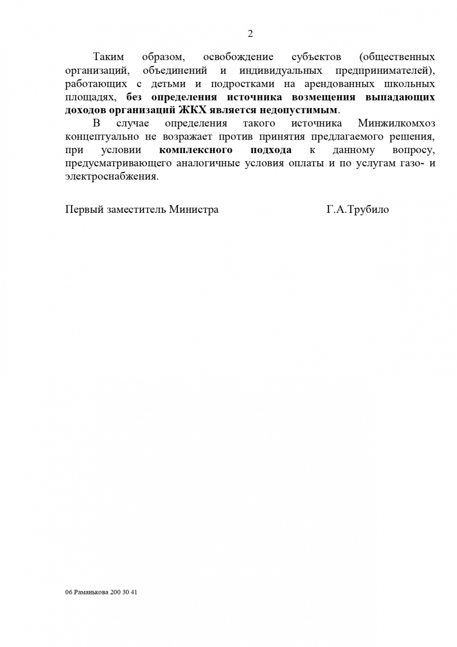 В случае определения источника возмещения выпадающих доходов организаций ЖКХ Минжилкомхоз концептуально не возражает против принятия предлагаемого решения при условии комплексного подхода к данному вопросу, предусматривающего аналогичные условия оплаты по услугам газо- и электроснабжения.