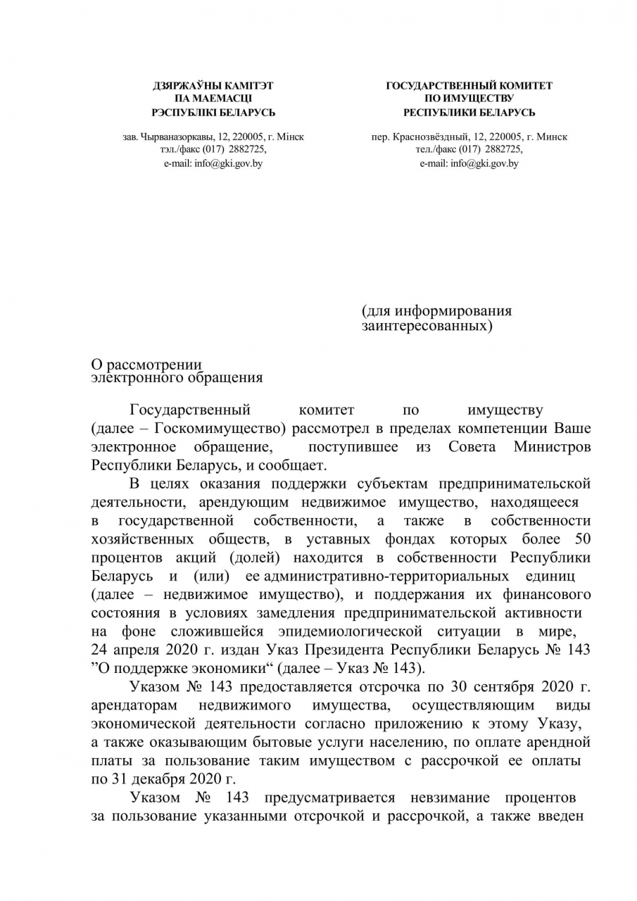 Указом Президента от 24.04.2020 №143 ”О поддержке экономики“:
